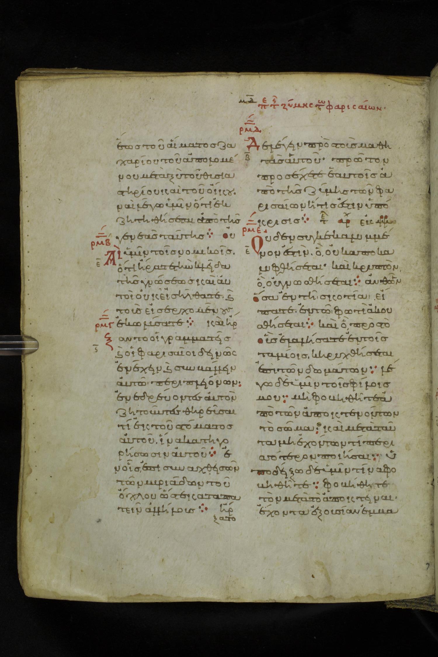 Eleventh century minuscule of the Gospels on parchment; 219 leaves, 2 columns, 26 lines per column. Images were taken at the National Library of Greece in Athens.