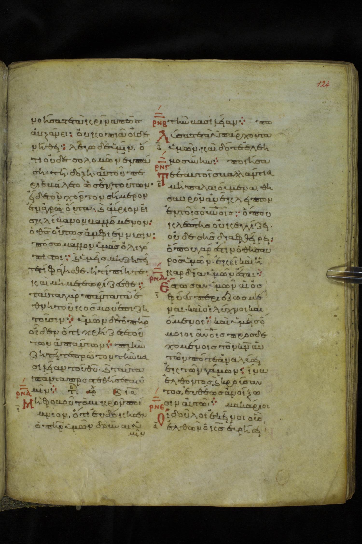 Eleventh century minuscule of the Gospels on parchment; 219 leaves, 2 columns, 26 lines per column. Images were taken at the National Library of Greece in Athens.