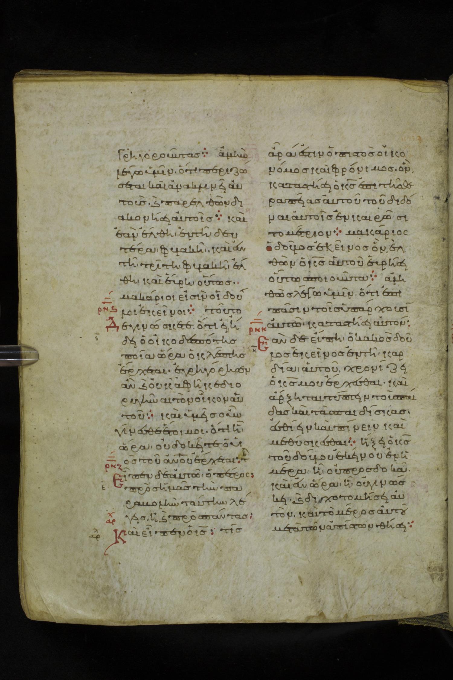 Eleventh century minuscule of the Gospels on parchment; 219 leaves, 2 columns, 26 lines per column. Images were taken at the National Library of Greece in Athens.