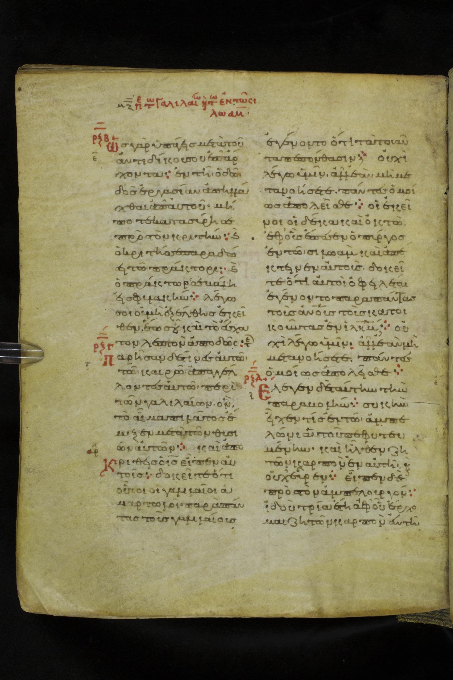 Eleventh century minuscule of the Gospels on parchment; 219 leaves, 2 columns, 26 lines per column. Images were taken at the National Library of Greece in Athens.