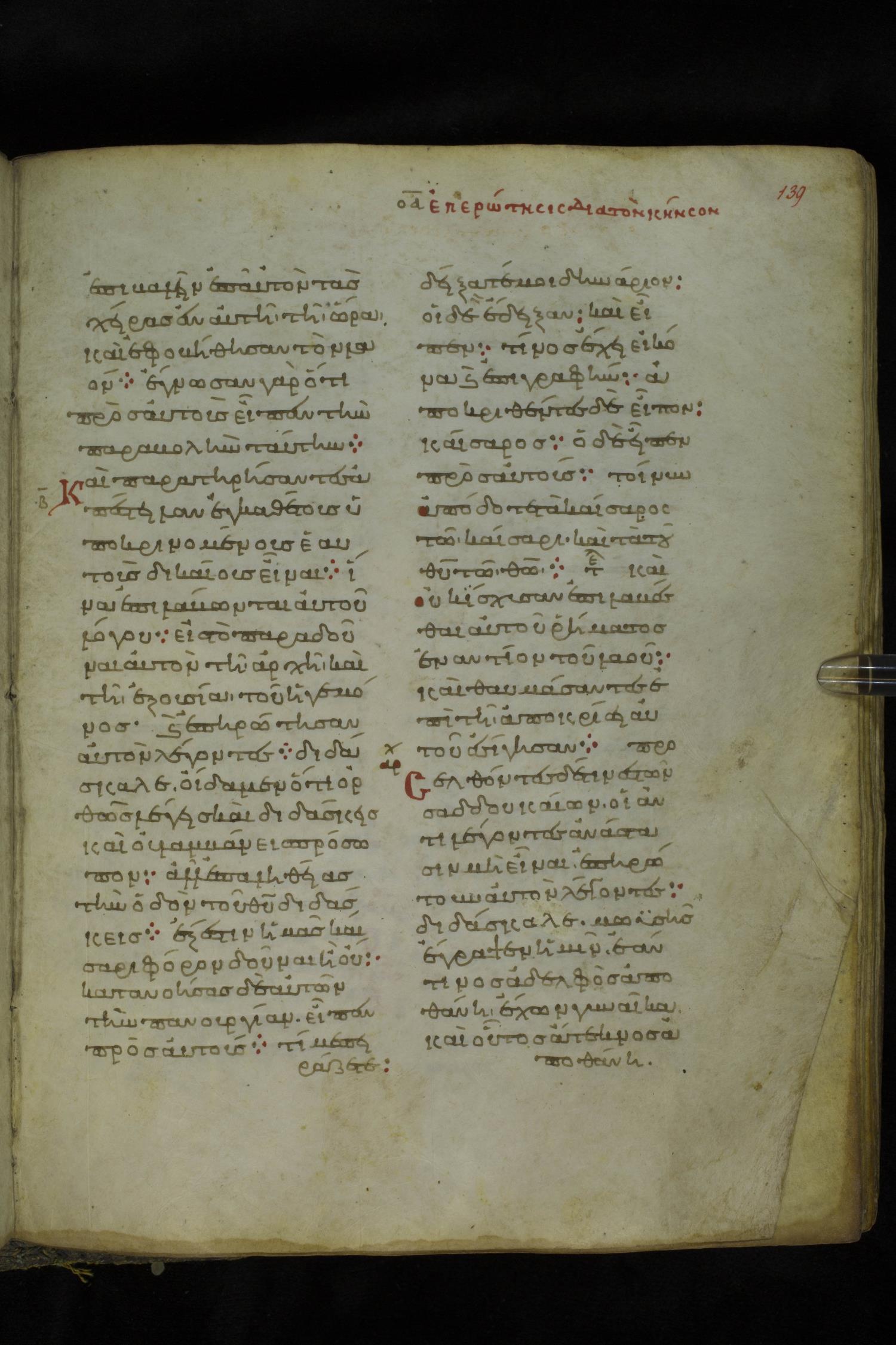 Eleventh century minuscule of the Gospels on parchment; 219 leaves, 2 columns, 26 lines per column. Images were taken at the National Library of Greece in Athens.