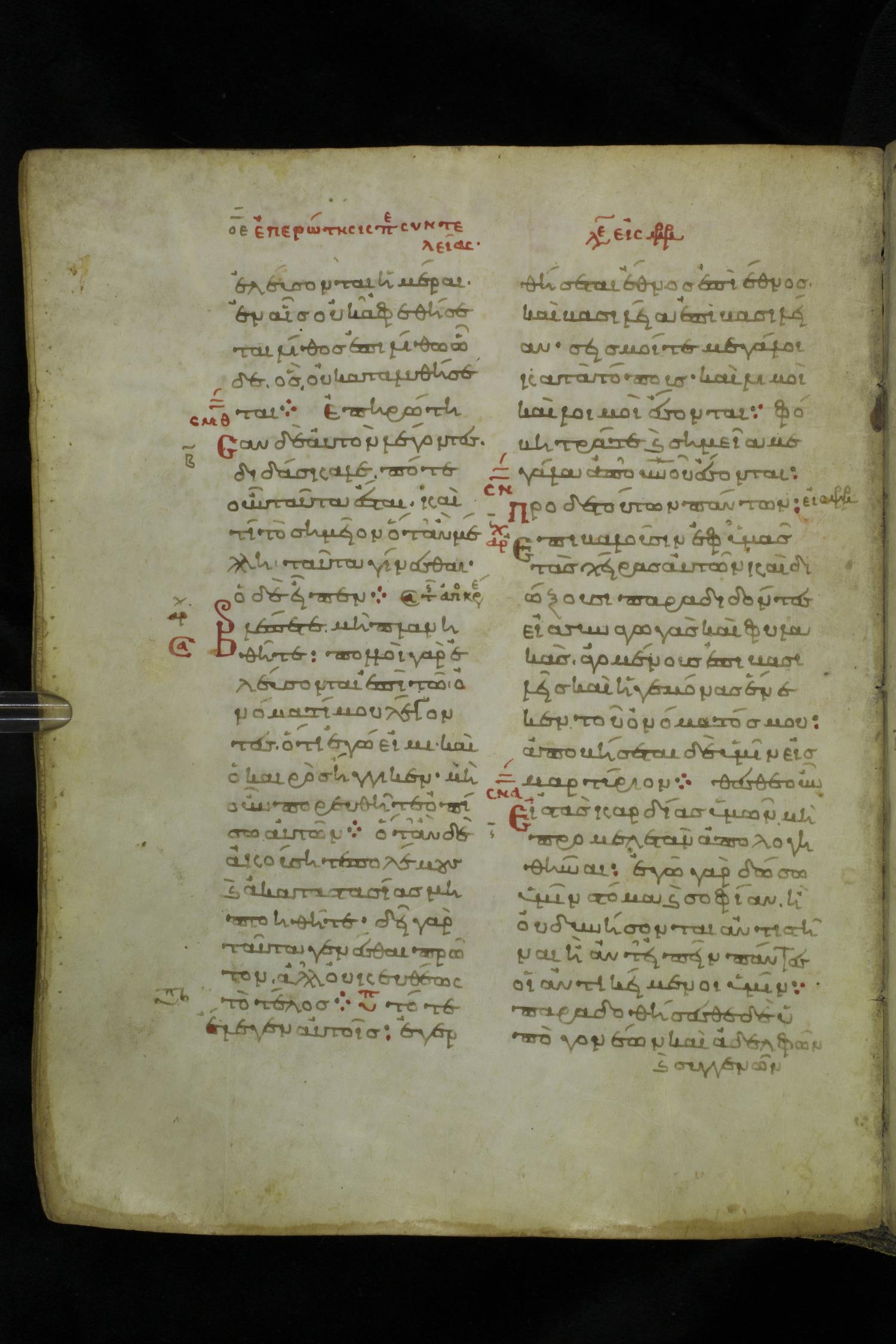 Eleventh century minuscule of the Gospels on parchment; 219 leaves, 2 columns, 26 lines per column. Images were taken at the National Library of Greece in Athens.