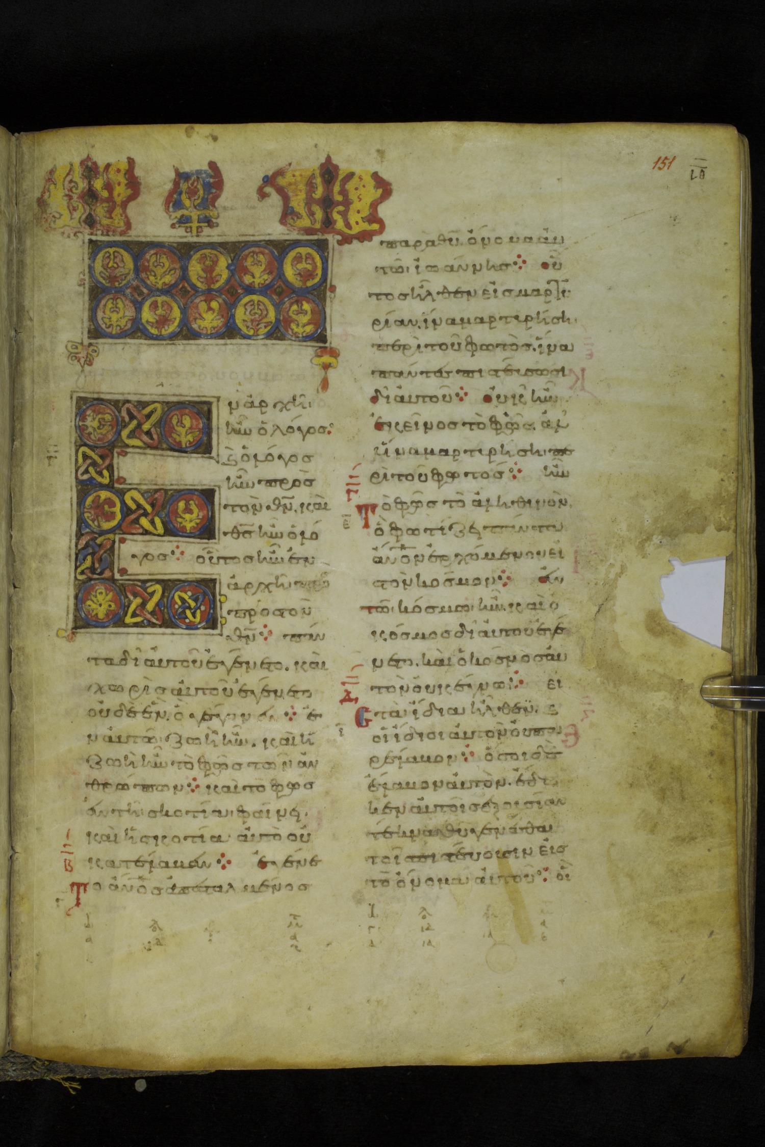 Eleventh century minuscule of the Gospels on parchment; 219 leaves, 2 columns, 26 lines per column. Images were taken at the National Library of Greece in Athens.