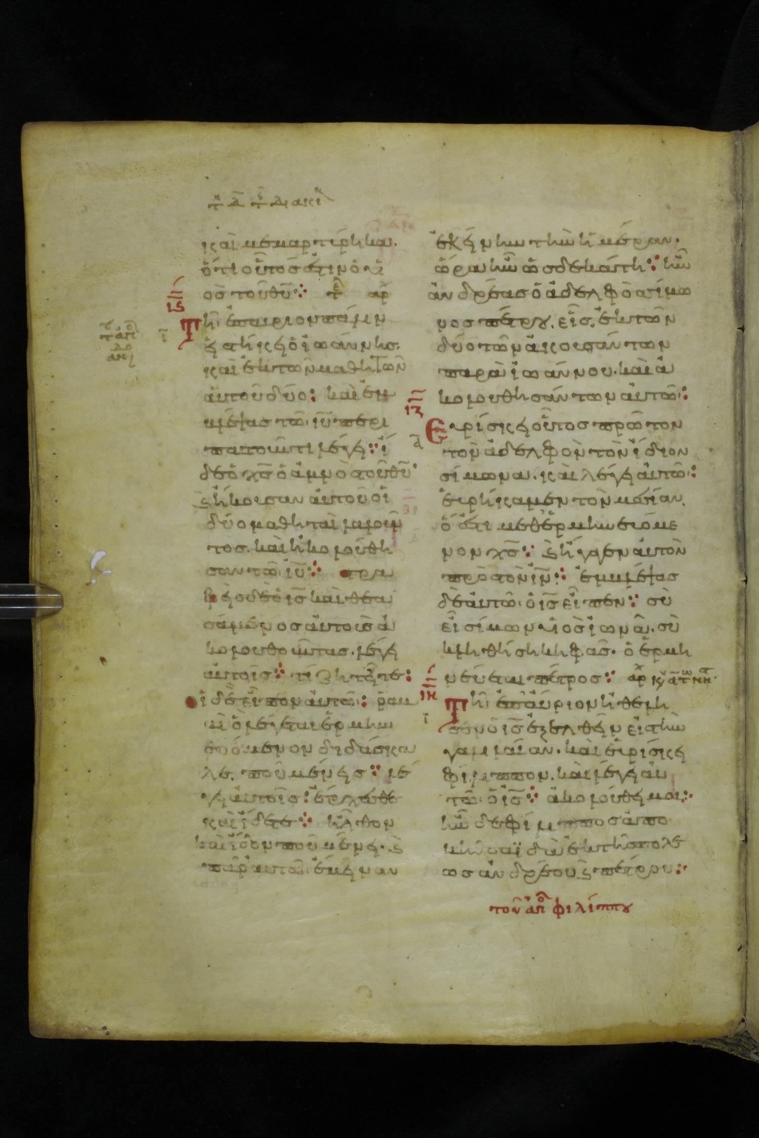 Eleventh century minuscule of the Gospels on parchment; 219 leaves, 2 columns, 26 lines per column. Images were taken at the National Library of Greece in Athens.