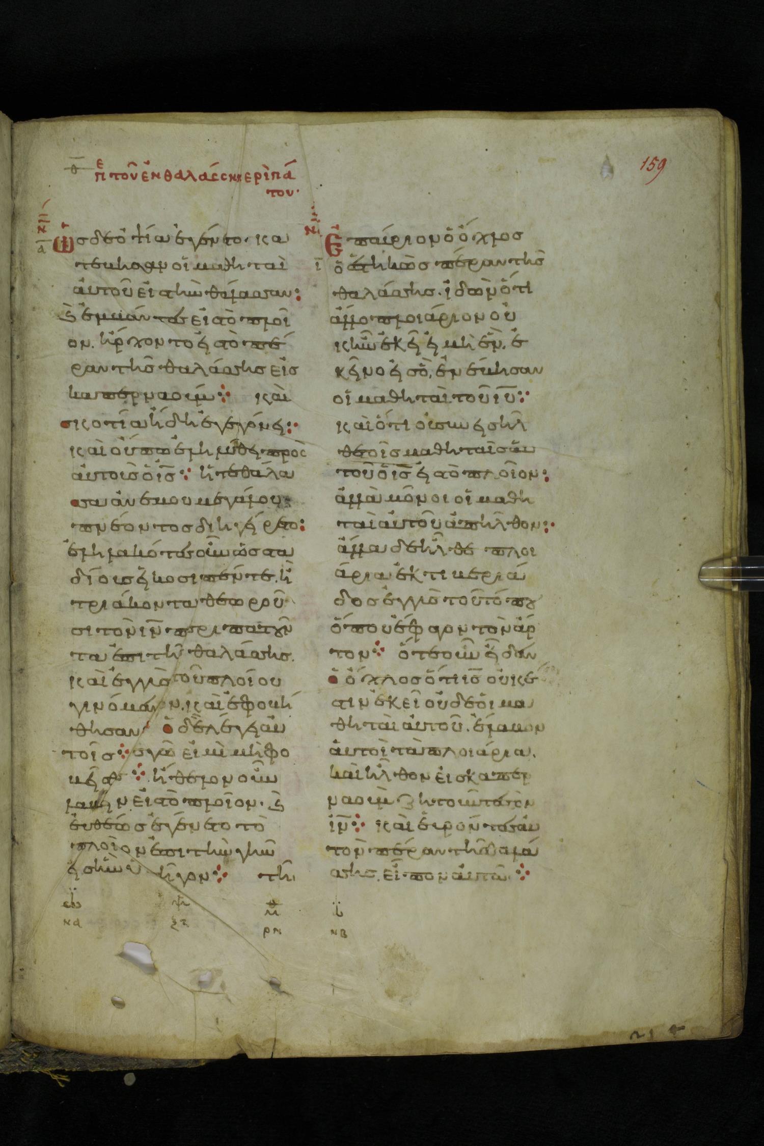 Eleventh century minuscule of the Gospels on parchment; 219 leaves, 2 columns, 26 lines per column. Images were taken at the National Library of Greece in Athens.
