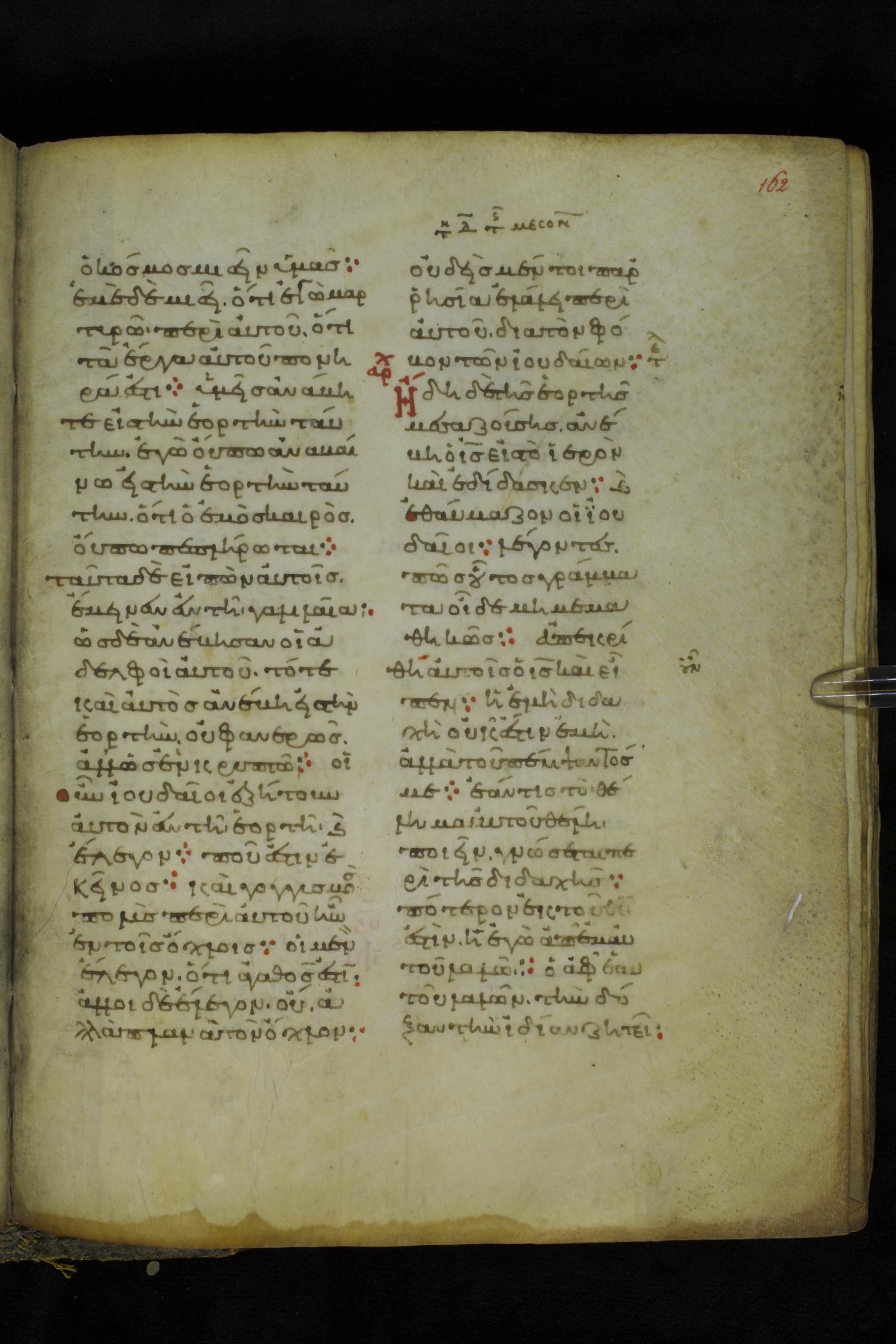 Eleventh century minuscule of the Gospels on parchment; 219 leaves, 2 columns, 26 lines per column. Images were taken at the National Library of Greece in Athens.