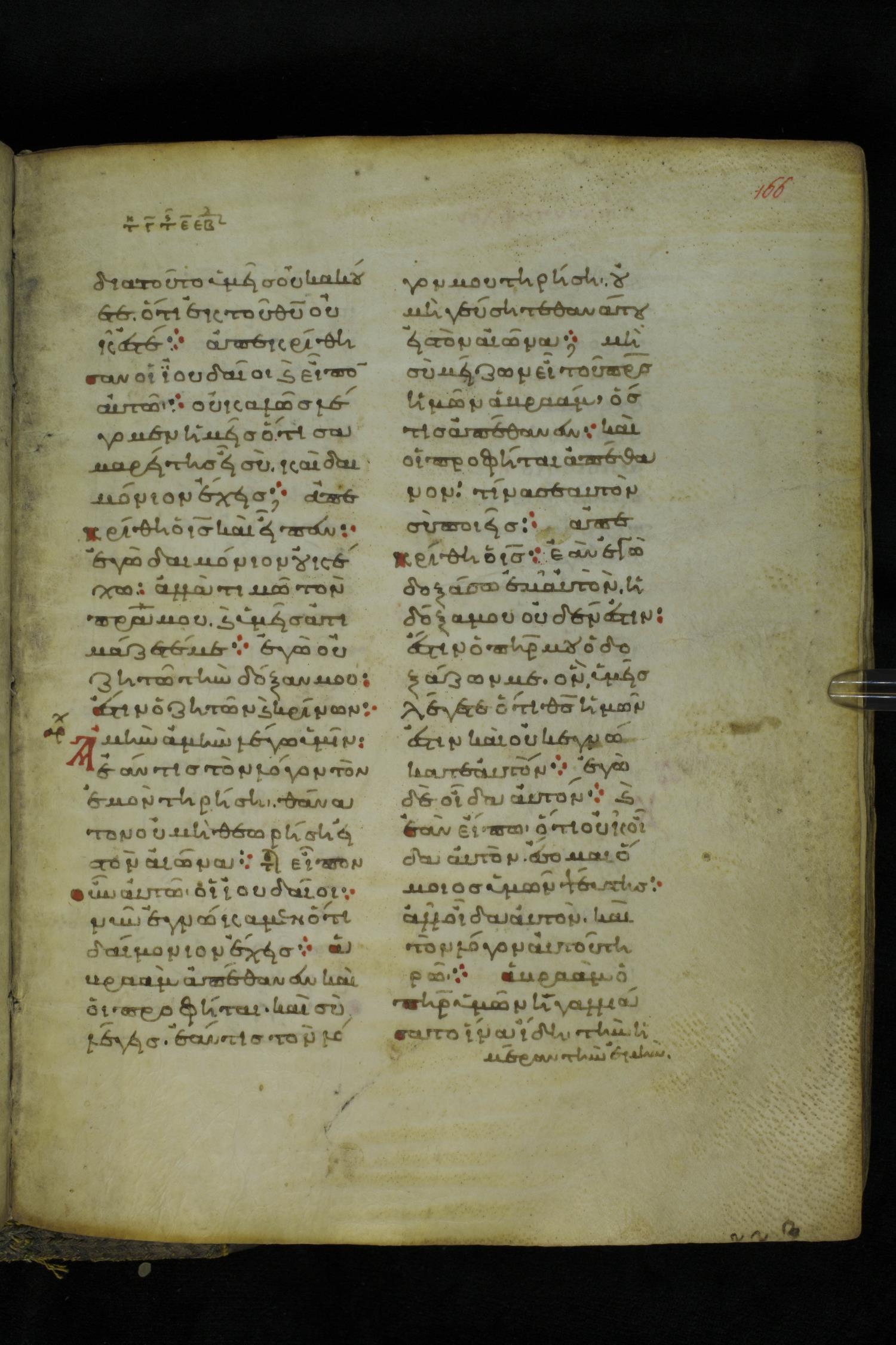 Eleventh century minuscule of the Gospels on parchment; 219 leaves, 2 columns, 26 lines per column. Images were taken at the National Library of Greece in Athens.
