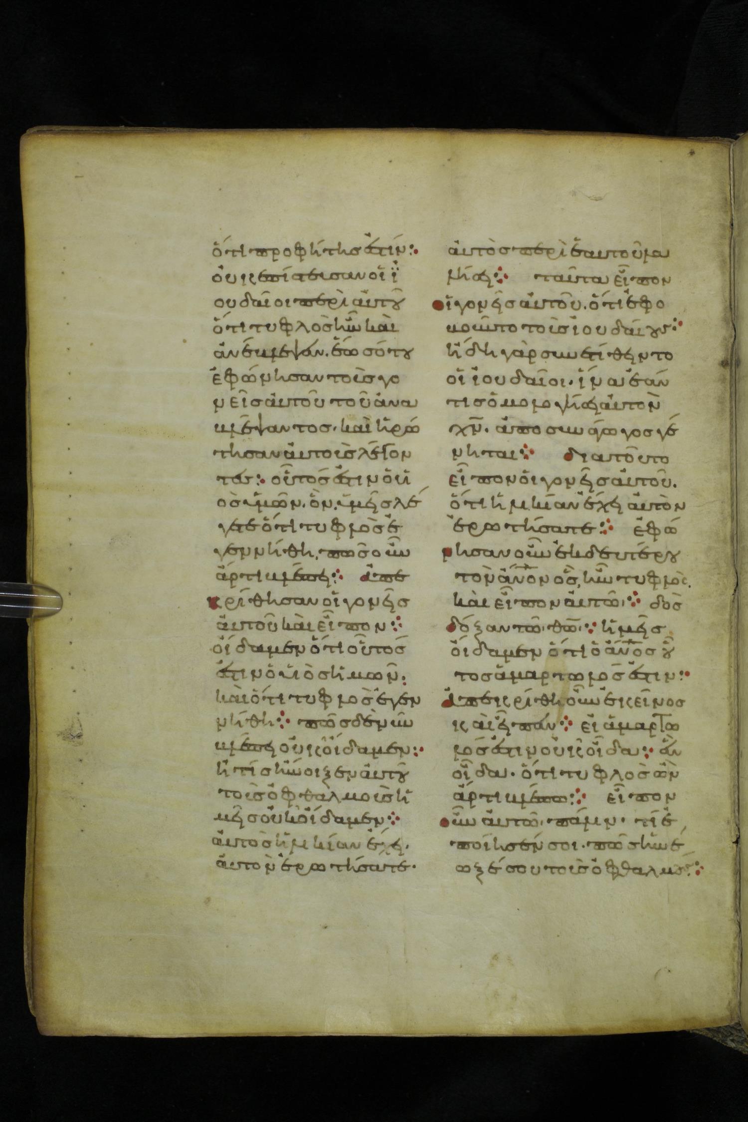 Eleventh century minuscule of the Gospels on parchment; 219 leaves, 2 columns, 26 lines per column. Images were taken at the National Library of Greece in Athens.