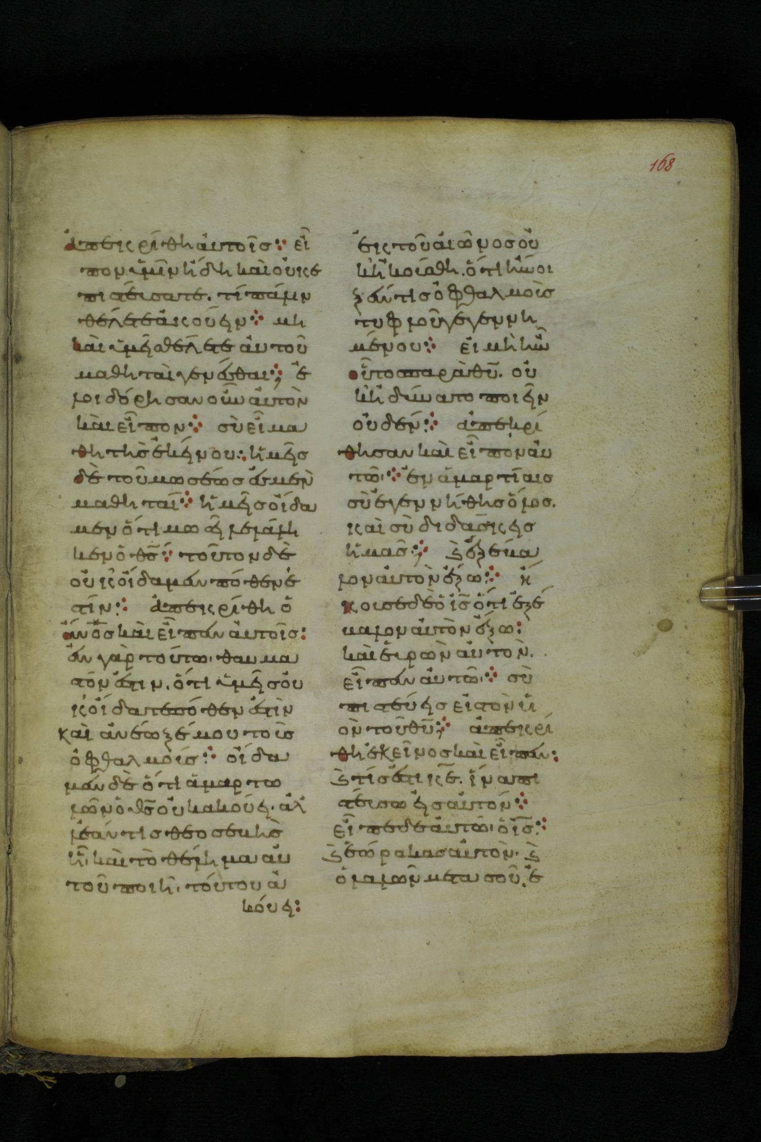 Eleventh century minuscule of the Gospels on parchment; 219 leaves, 2 columns, 26 lines per column. Images were taken at the National Library of Greece in Athens.