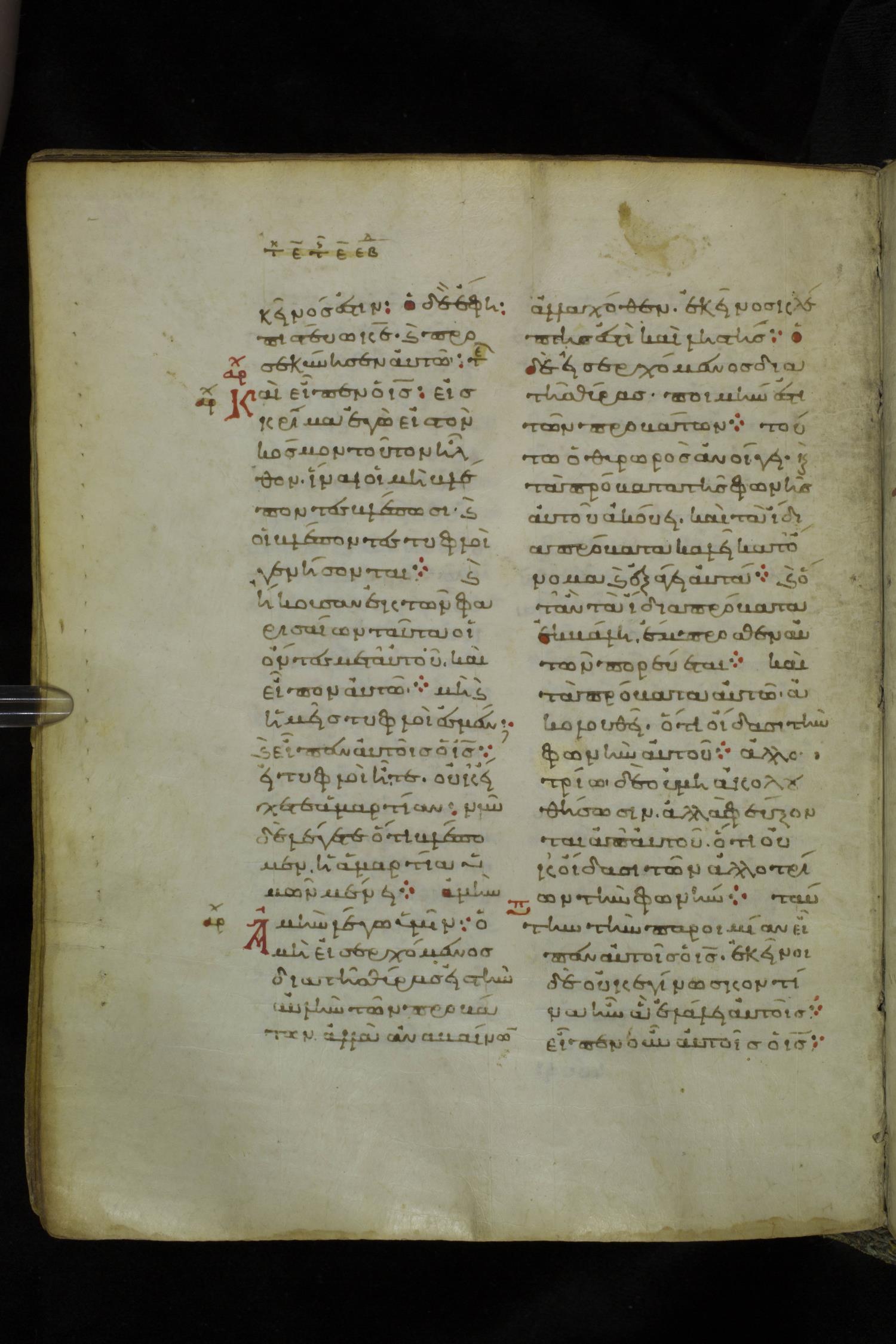 Eleventh century minuscule of the Gospels on parchment; 219 leaves, 2 columns, 26 lines per column. Images were taken at the National Library of Greece in Athens.