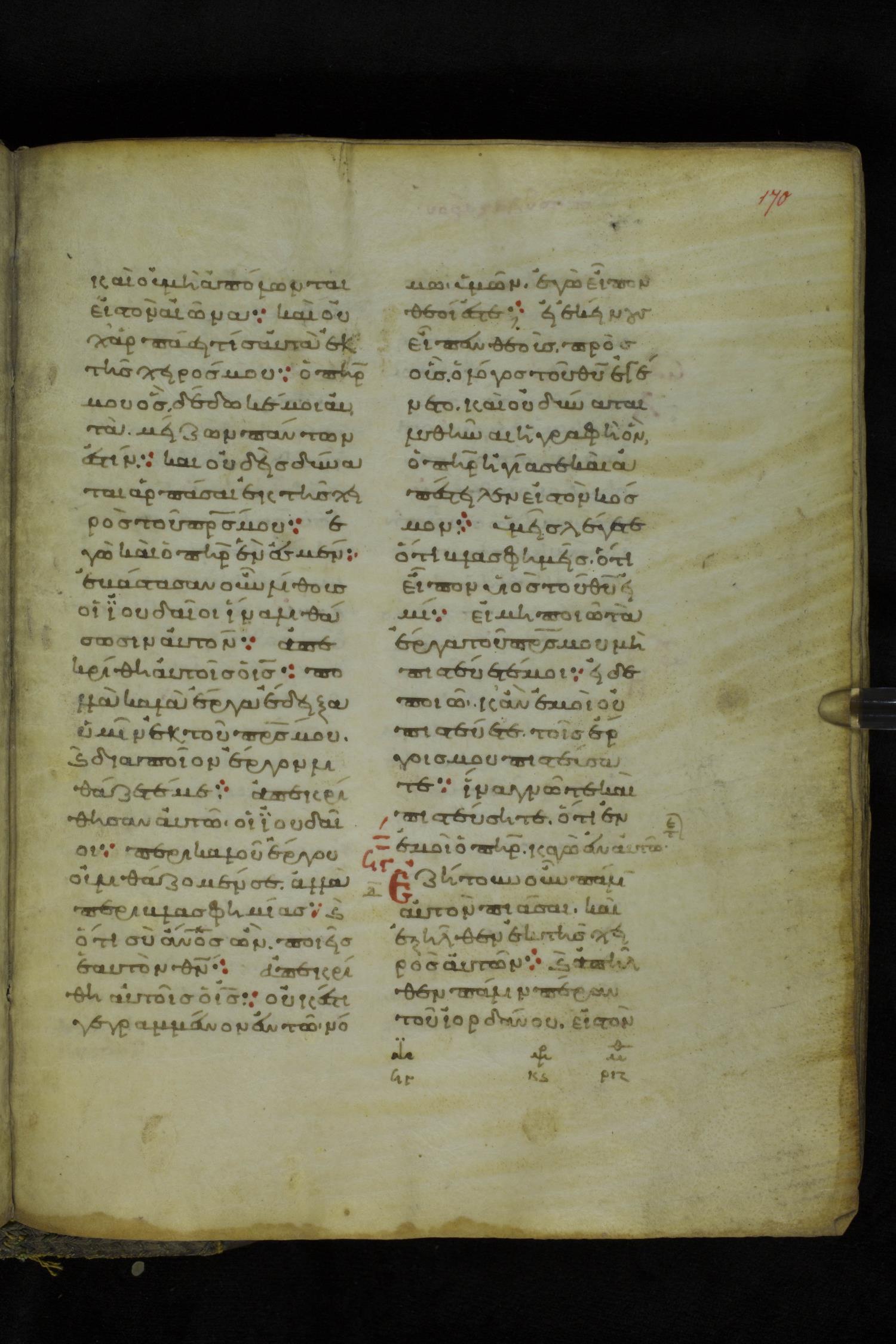 Eleventh century minuscule of the Gospels on parchment; 219 leaves, 2 columns, 26 lines per column. Images were taken at the National Library of Greece in Athens.