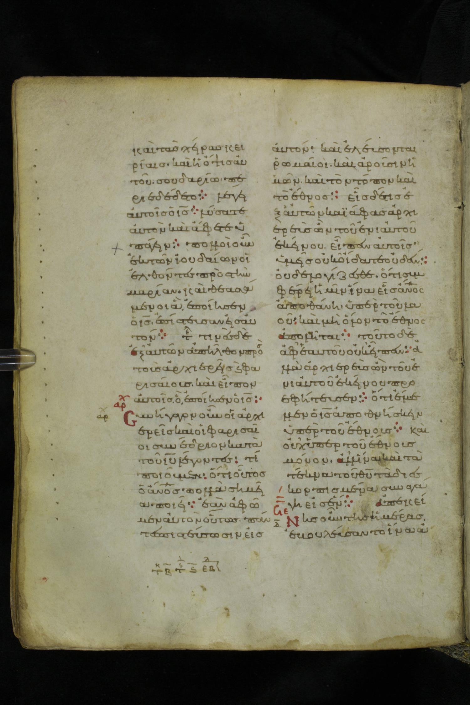 Eleventh century minuscule of the Gospels on parchment; 219 leaves, 2 columns, 26 lines per column. Images were taken at the National Library of Greece in Athens.