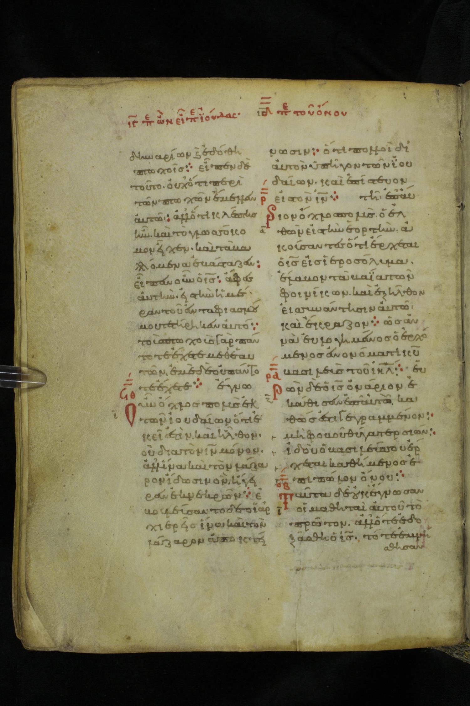 Eleventh century minuscule of the Gospels on parchment; 219 leaves, 2 columns, 26 lines per column. Images were taken at the National Library of Greece in Athens.