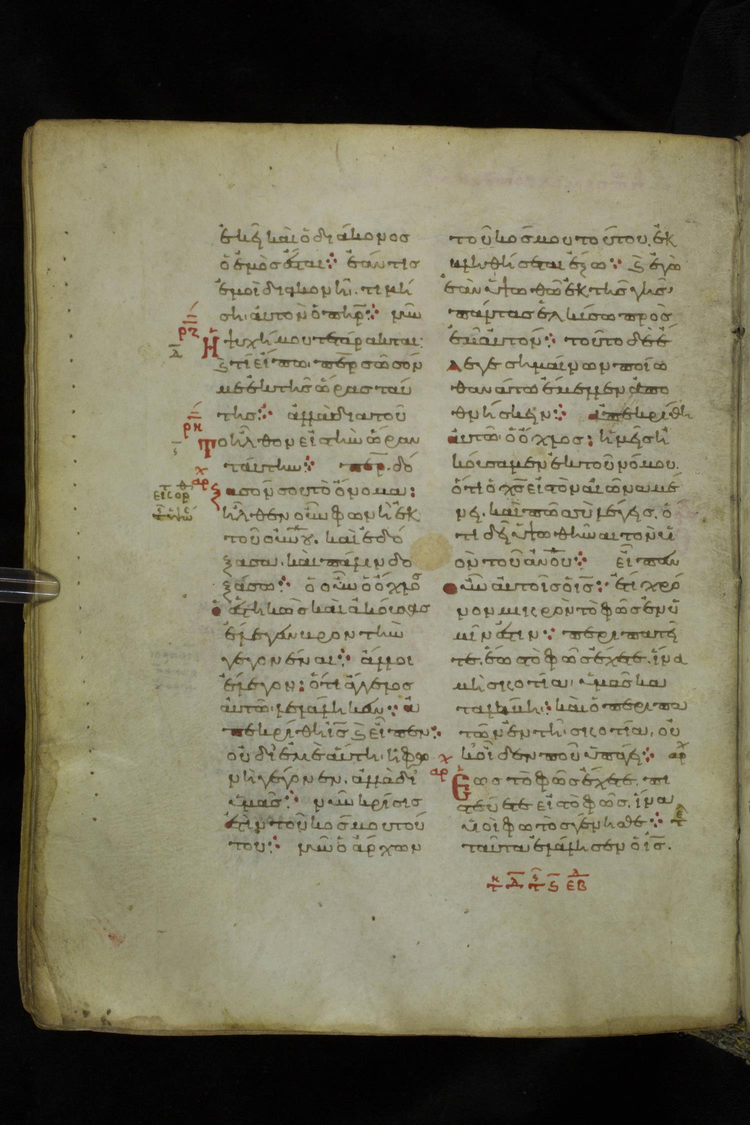 Eleventh century minuscule of the Gospels on parchment; 219 leaves, 2 columns, 26 lines per column. Images were taken at the National Library of Greece in Athens.