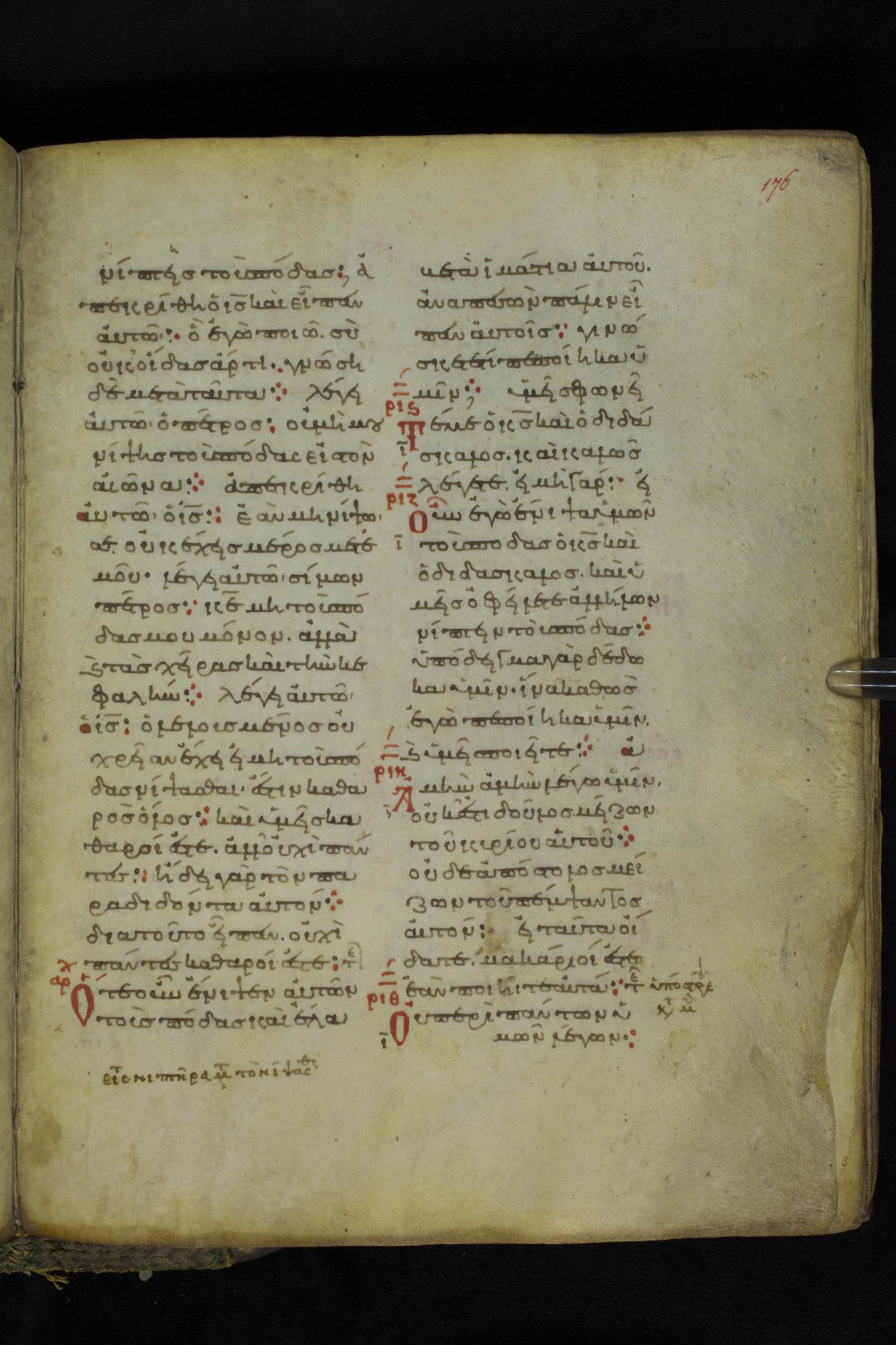 Eleventh century minuscule of the Gospels on parchment; 219 leaves, 2 columns, 26 lines per column. Images were taken at the National Library of Greece in Athens.