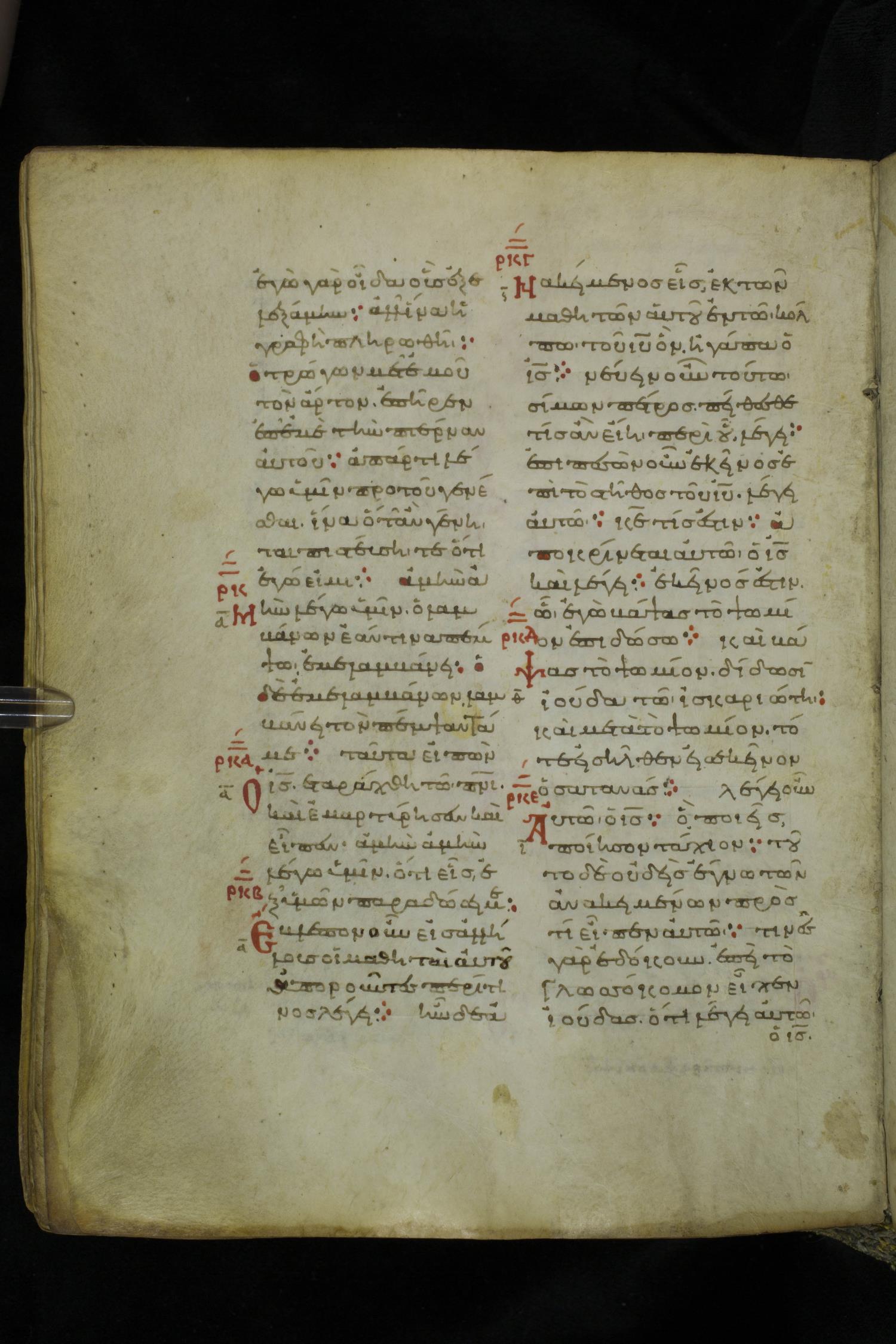 Eleventh century minuscule of the Gospels on parchment; 219 leaves, 2 columns, 26 lines per column. Images were taken at the National Library of Greece in Athens.