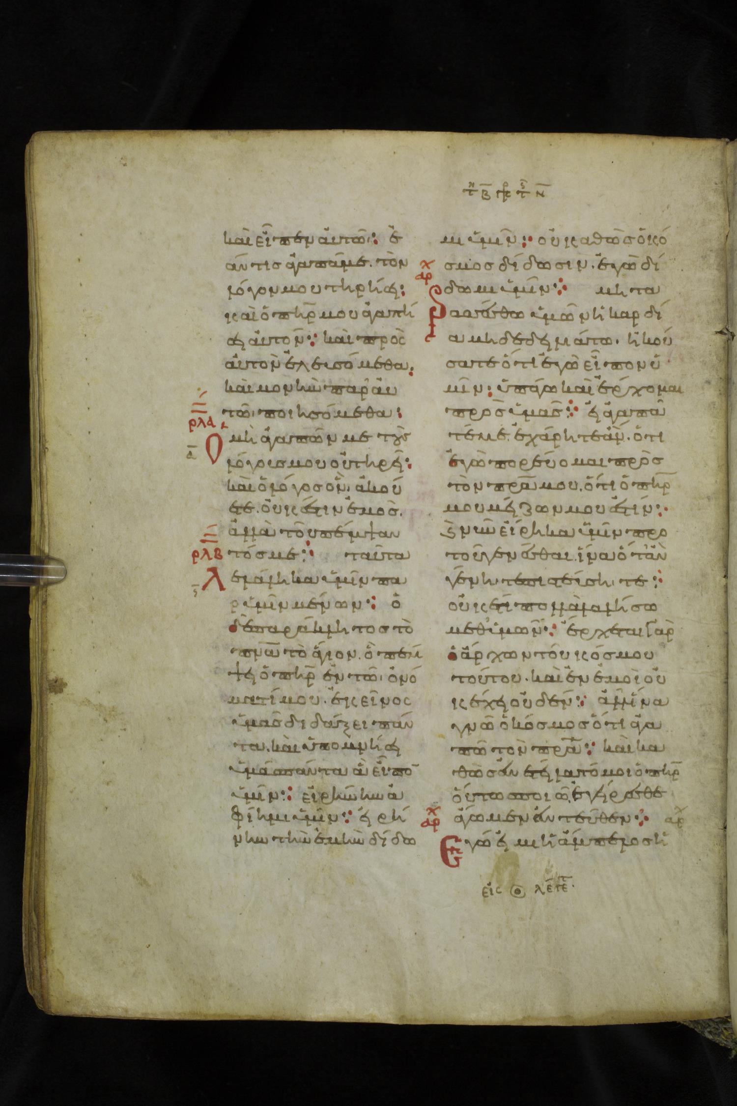 Eleventh century minuscule of the Gospels on parchment; 219 leaves, 2 columns, 26 lines per column. Images were taken at the National Library of Greece in Athens.