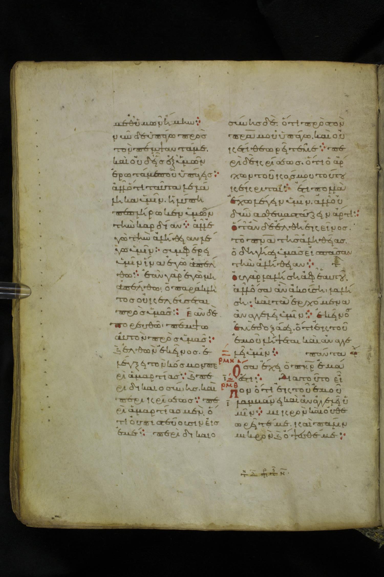 Eleventh century minuscule of the Gospels on parchment; 219 leaves, 2 columns, 26 lines per column. Images were taken at the National Library of Greece in Athens.