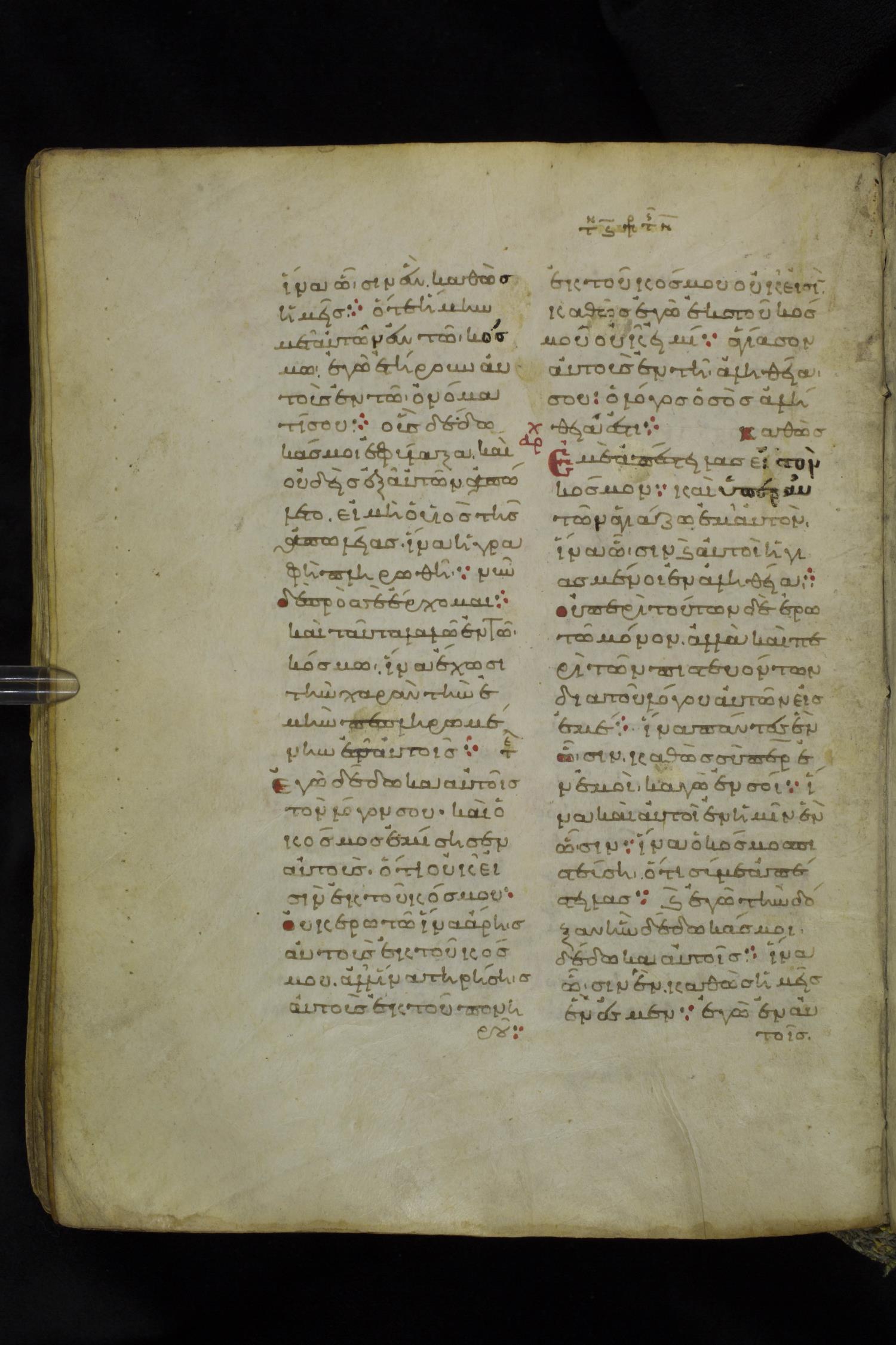 Eleventh century minuscule of the Gospels on parchment; 219 leaves, 2 columns, 26 lines per column. Images were taken at the National Library of Greece in Athens.