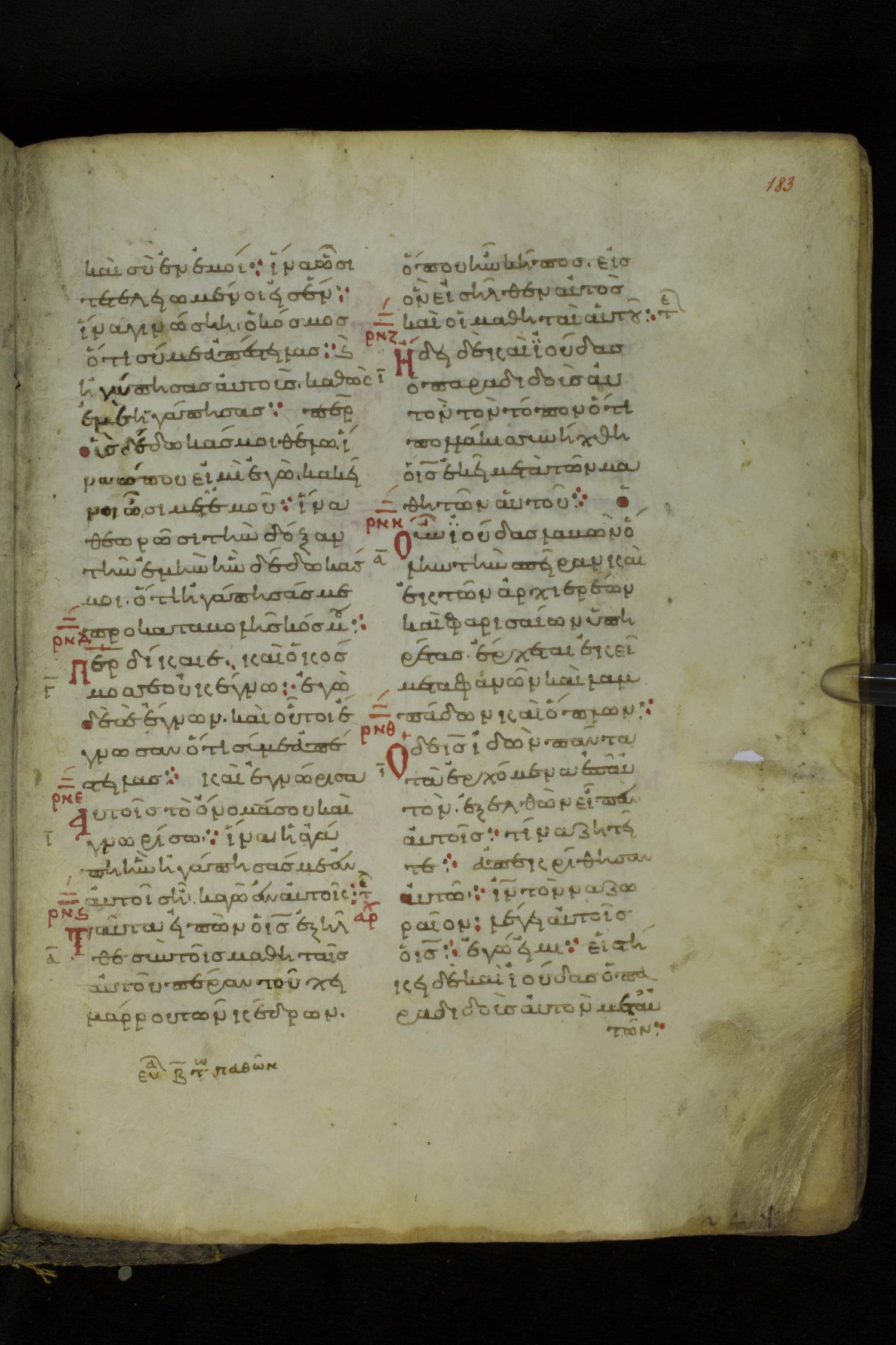 Eleventh century minuscule of the Gospels on parchment; 219 leaves, 2 columns, 26 lines per column. Images were taken at the National Library of Greece in Athens.