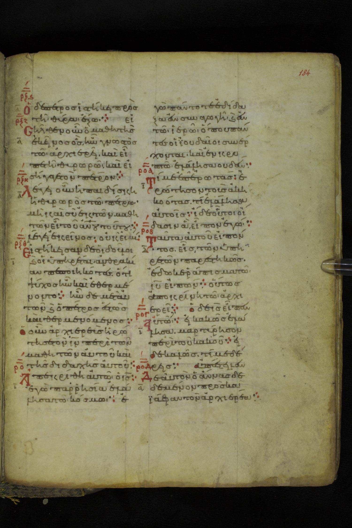 Eleventh century minuscule of the Gospels on parchment; 219 leaves, 2 columns, 26 lines per column. Images were taken at the National Library of Greece in Athens.