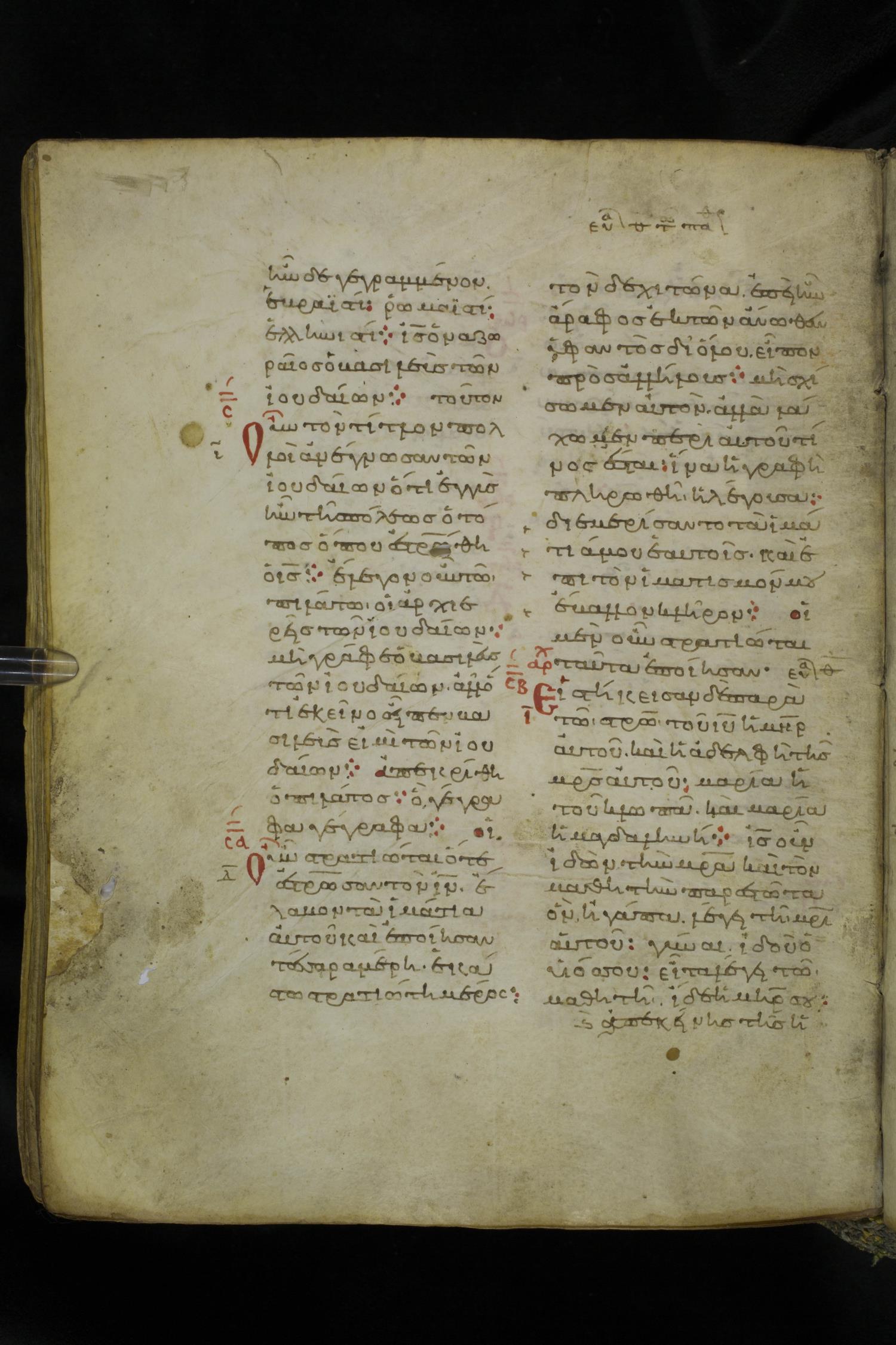 Eleventh century minuscule of the Gospels on parchment; 219 leaves, 2 columns, 26 lines per column. Images were taken at the National Library of Greece in Athens.