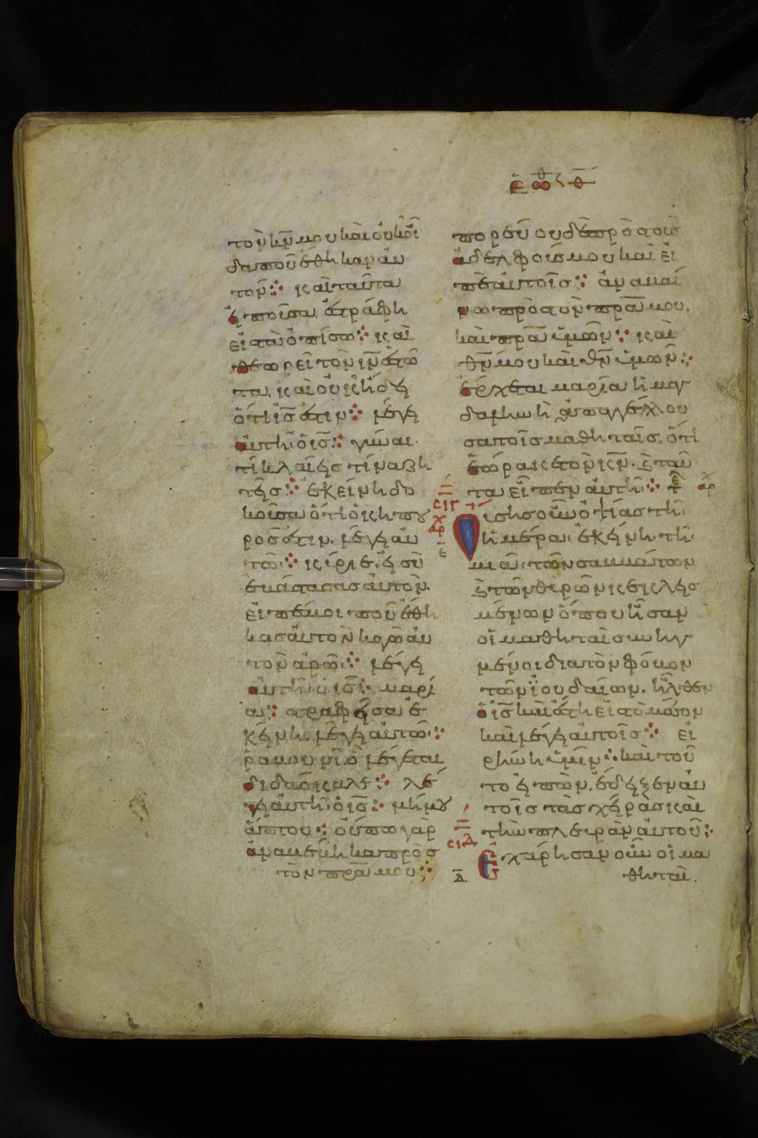 Eleventh century minuscule of the Gospels on parchment; 219 leaves, 2 columns, 26 lines per column. Images were taken at the National Library of Greece in Athens.