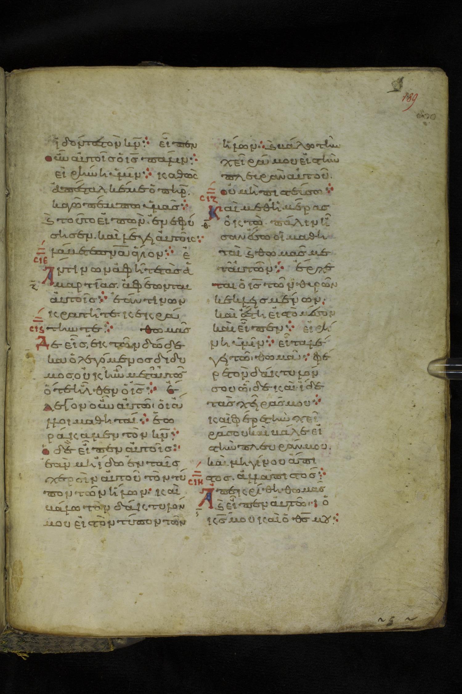 Eleventh century minuscule of the Gospels on parchment; 219 leaves, 2 columns, 26 lines per column. Images were taken at the National Library of Greece in Athens.