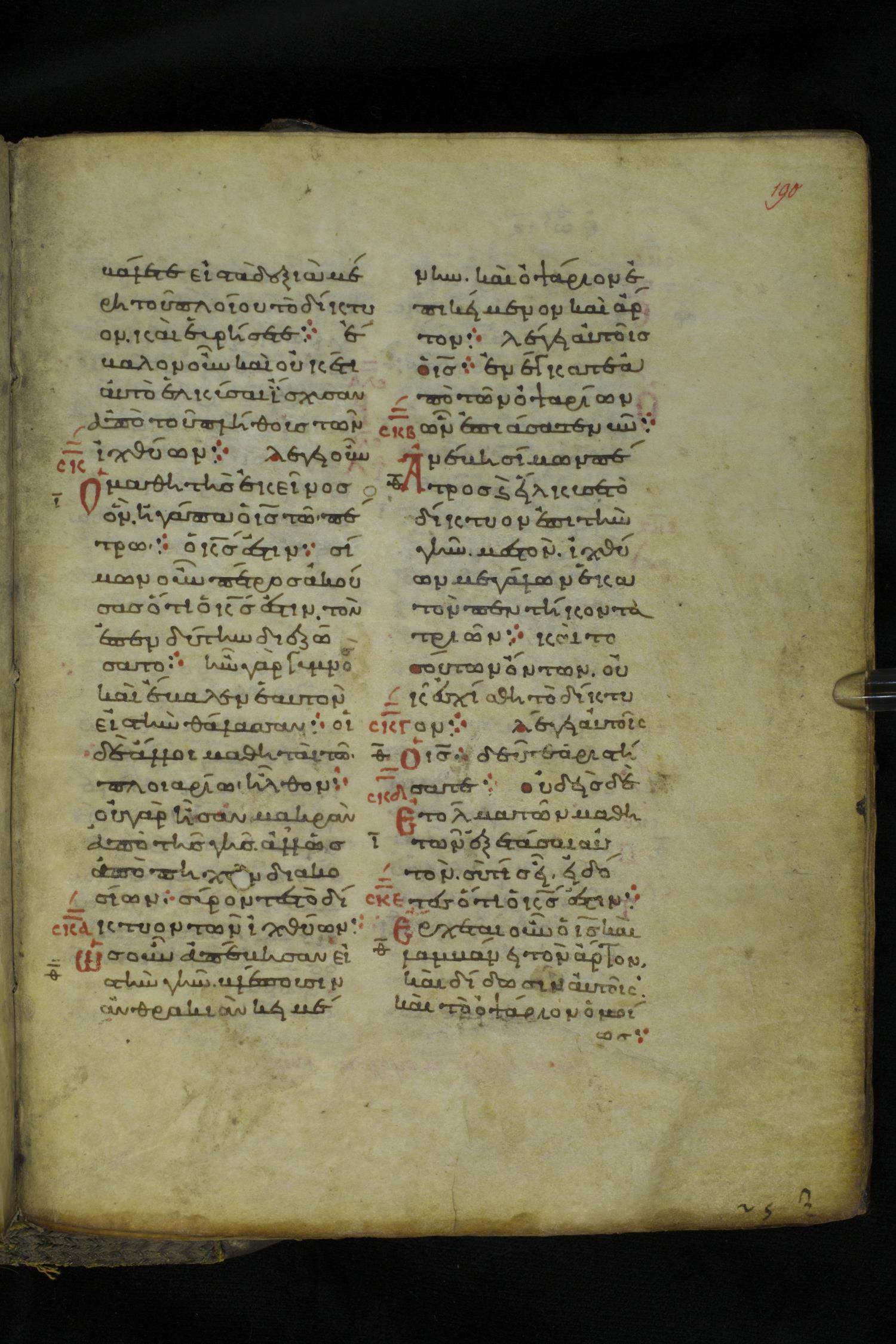 Eleventh century minuscule of the Gospels on parchment; 219 leaves, 2 columns, 26 lines per column. Images were taken at the National Library of Greece in Athens.