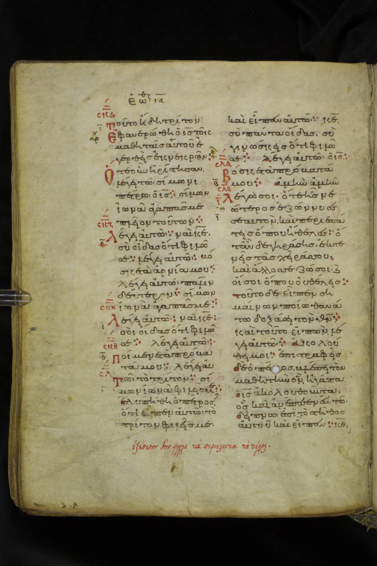 Eleventh century minuscule of the Gospels on parchment; 219 leaves, 2 columns, 26 lines per column. Images were taken at the National Library of Greece in Athens.