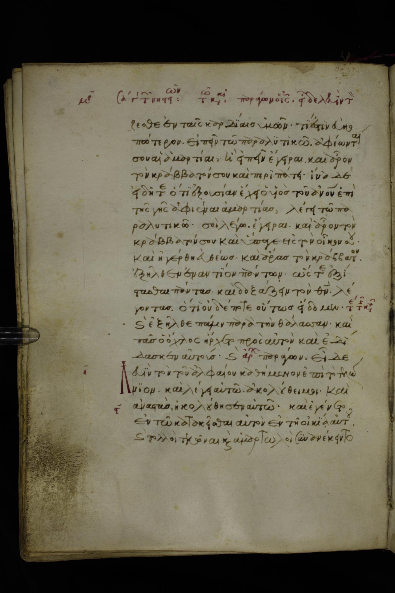 Fourteenth century minuscule of the Gospels on parchment; 250 leaves, 1 column, 20-21 lines per column. Images were taken at the National Library of Greece in Athens.