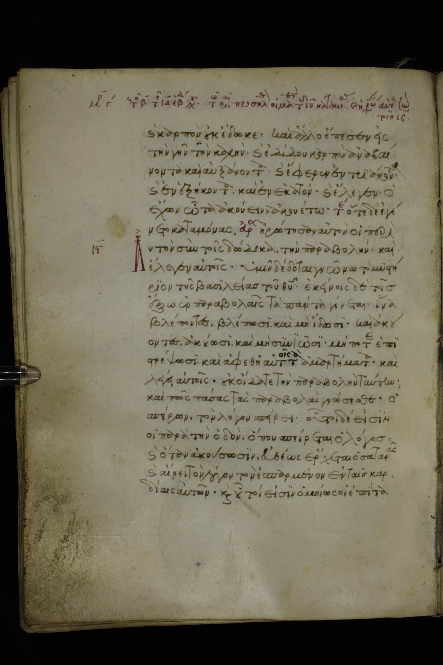 Fourteenth century minuscule of the Gospels on parchment; 250 leaves, 1 column, 20-21 lines per column. Images were taken at the National Library of Greece in Athens.
