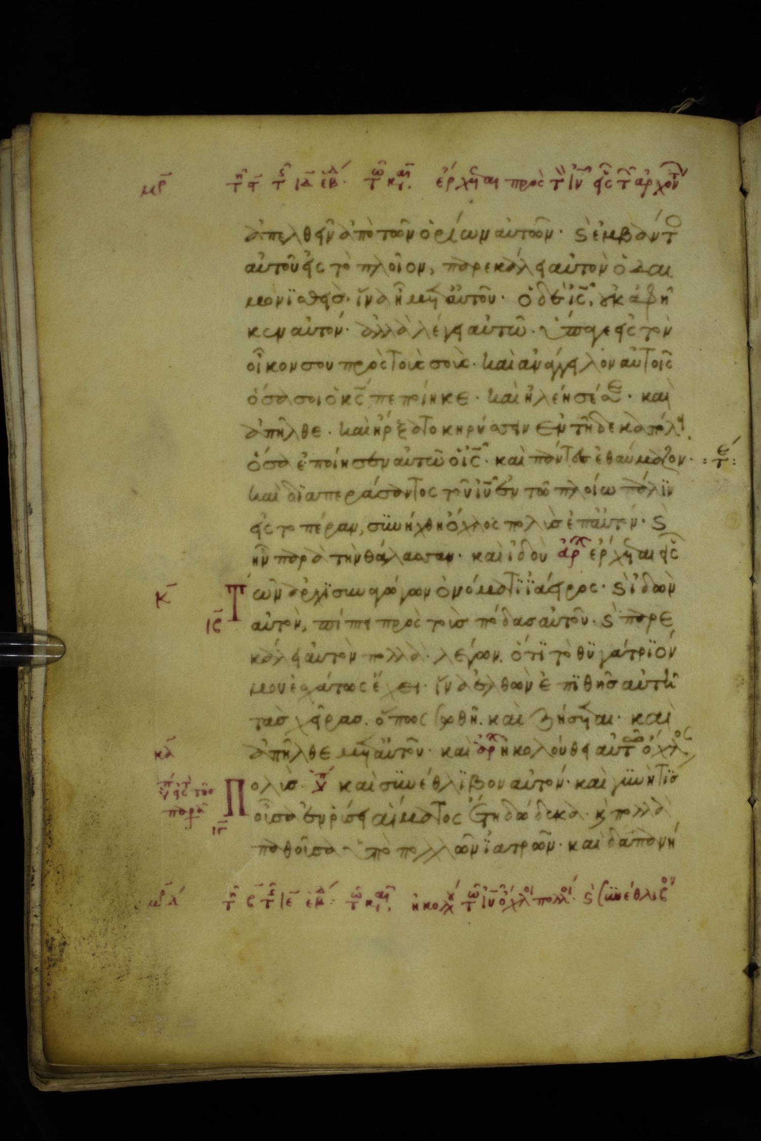 Fourteenth century minuscule of the Gospels on parchment; 250 leaves, 1 column, 20-21 lines per column. Images were taken at the National Library of Greece in Athens.