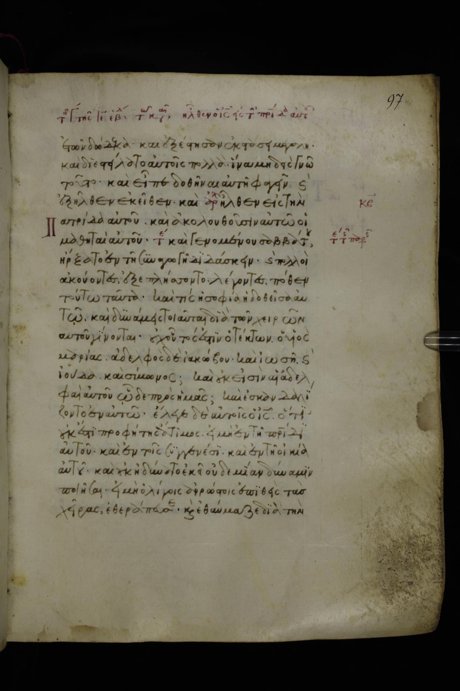 Fourteenth century minuscule of the Gospels on parchment; 250 leaves, 1 column, 20-21 lines per column. Images were taken at the National Library of Greece in Athens.