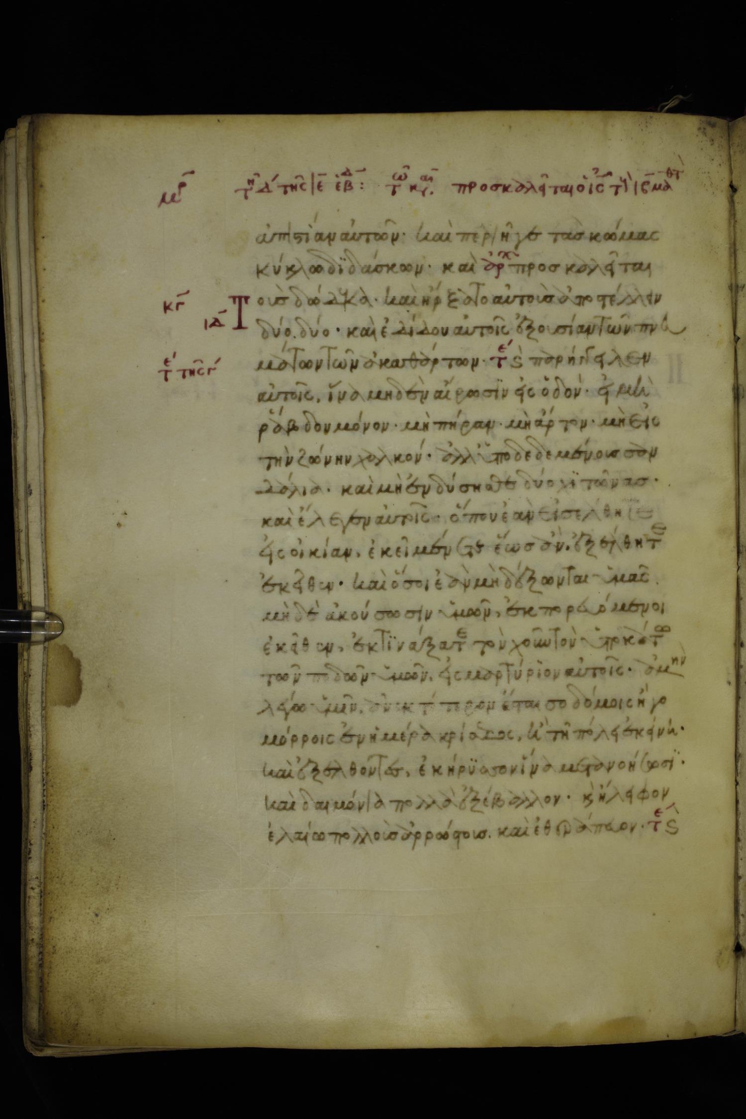 Fourteenth century minuscule of the Gospels on parchment; 250 leaves, 1 column, 20-21 lines per column. Images were taken at the National Library of Greece in Athens.