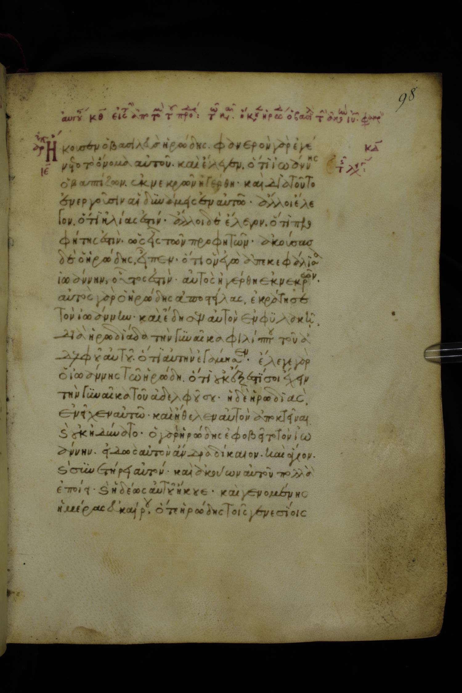 Fourteenth century minuscule of the Gospels on parchment; 250 leaves, 1 column, 20-21 lines per column. Images were taken at the National Library of Greece in Athens.