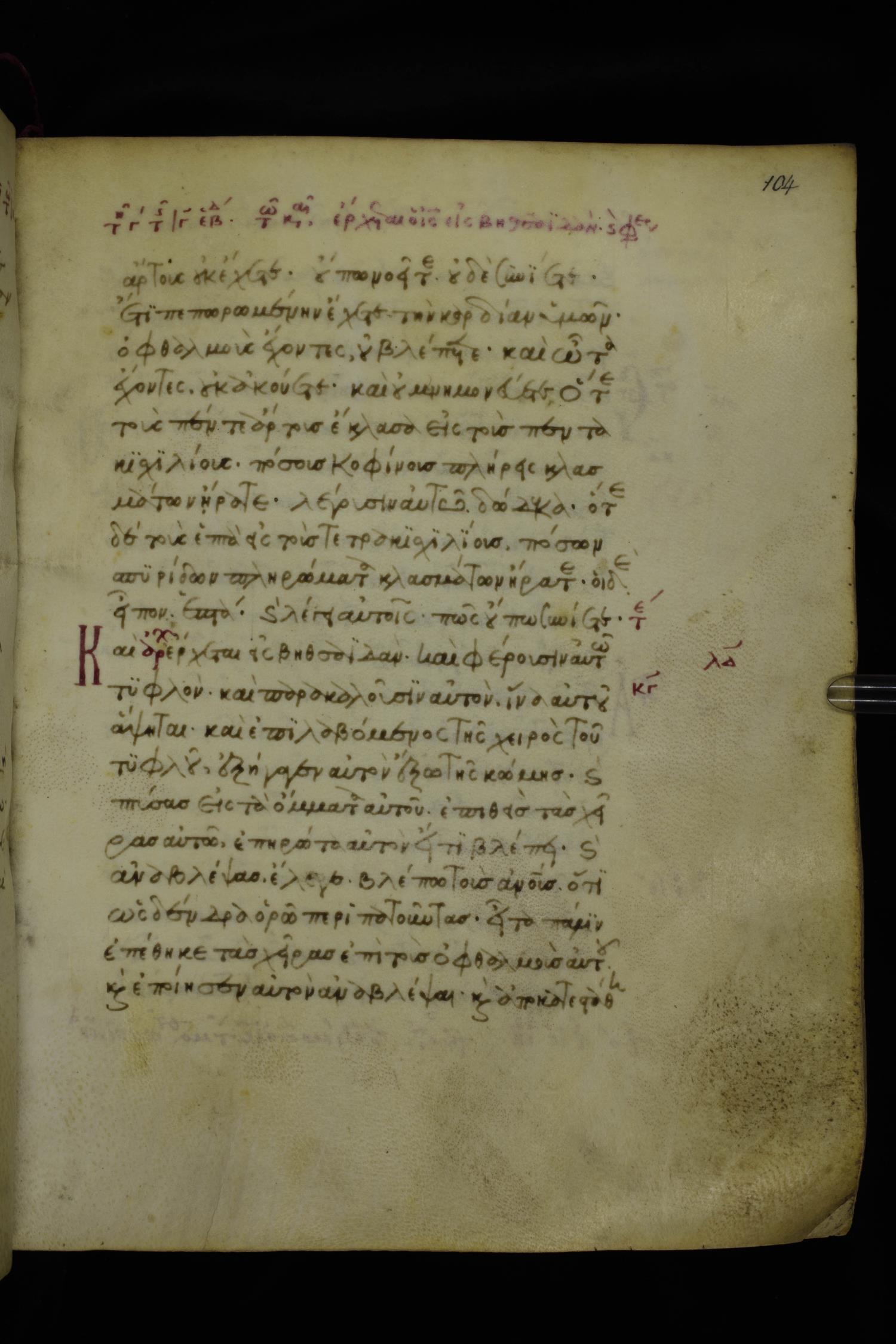 Fourteenth century minuscule of the Gospels on parchment; 250 leaves, 1 column, 20-21 lines per column. Images were taken at the National Library of Greece in Athens.