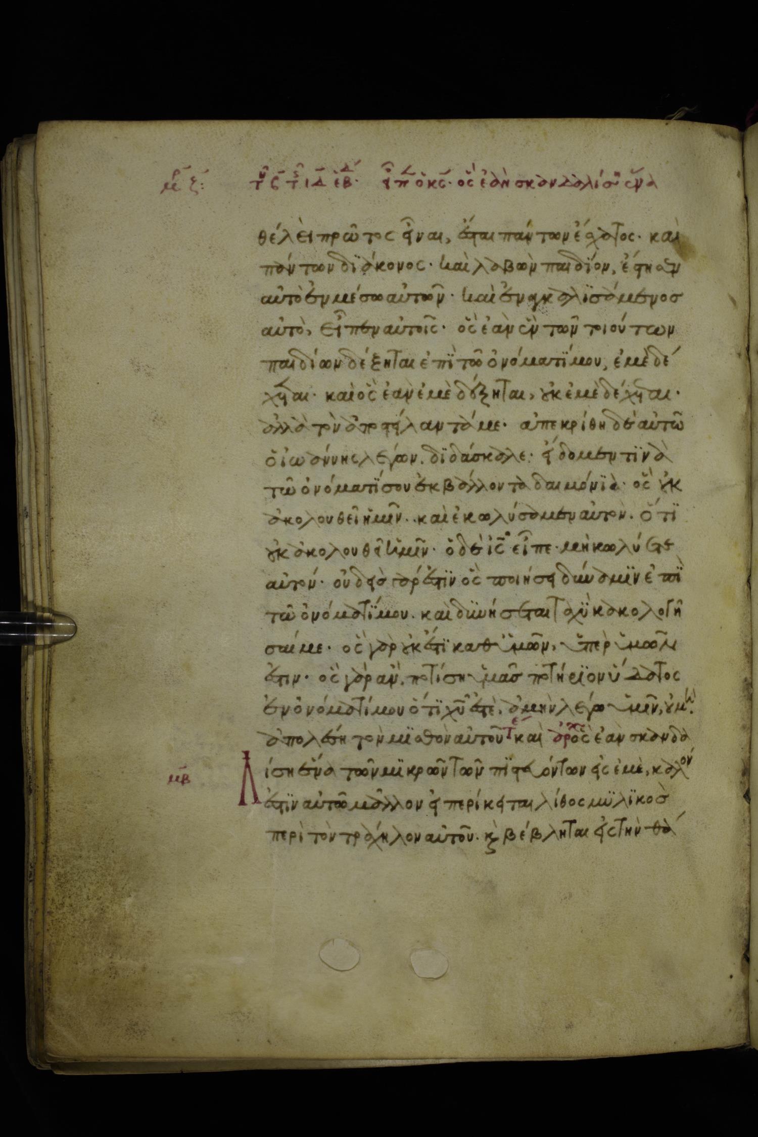 Fourteenth century minuscule of the Gospels on parchment; 250 leaves, 1 column, 20-21 lines per column. Images were taken at the National Library of Greece in Athens.
