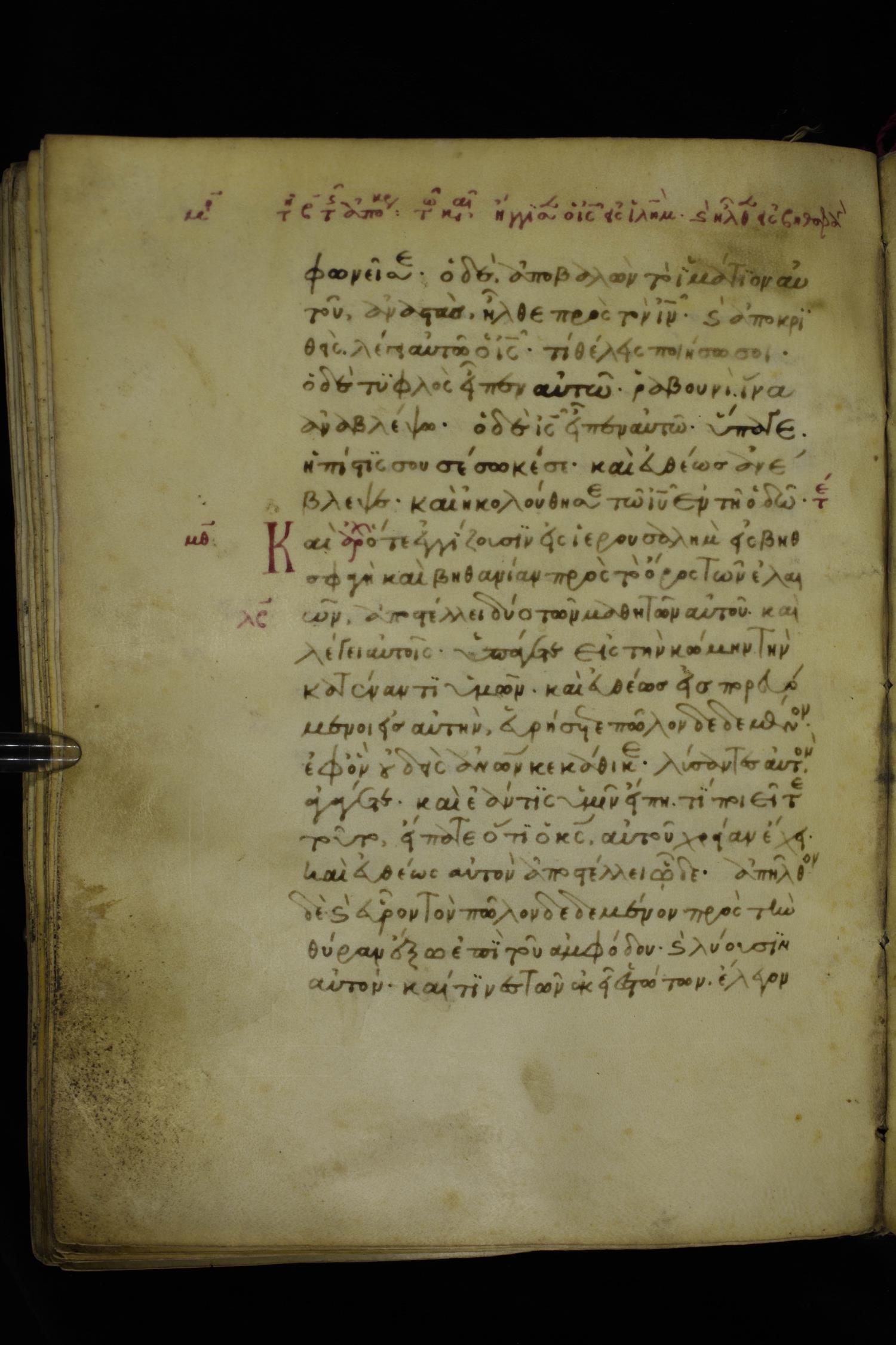 Fourteenth century minuscule of the Gospels on parchment; 250 leaves, 1 column, 20-21 lines per column. Images were taken at the National Library of Greece in Athens.
