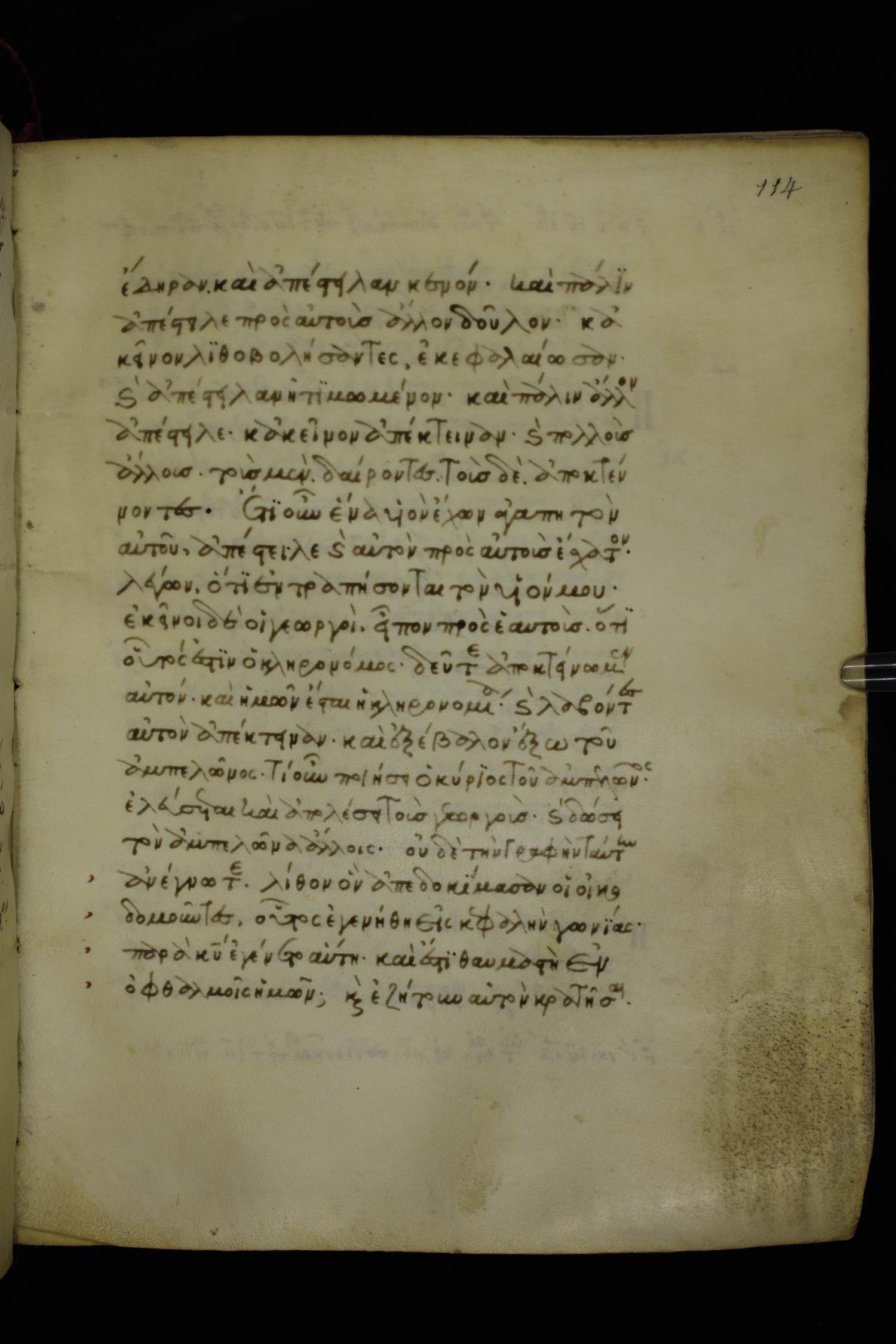 Fourteenth century minuscule of the Gospels on parchment; 250 leaves, 1 column, 20-21 lines per column. Images were taken at the National Library of Greece in Athens.