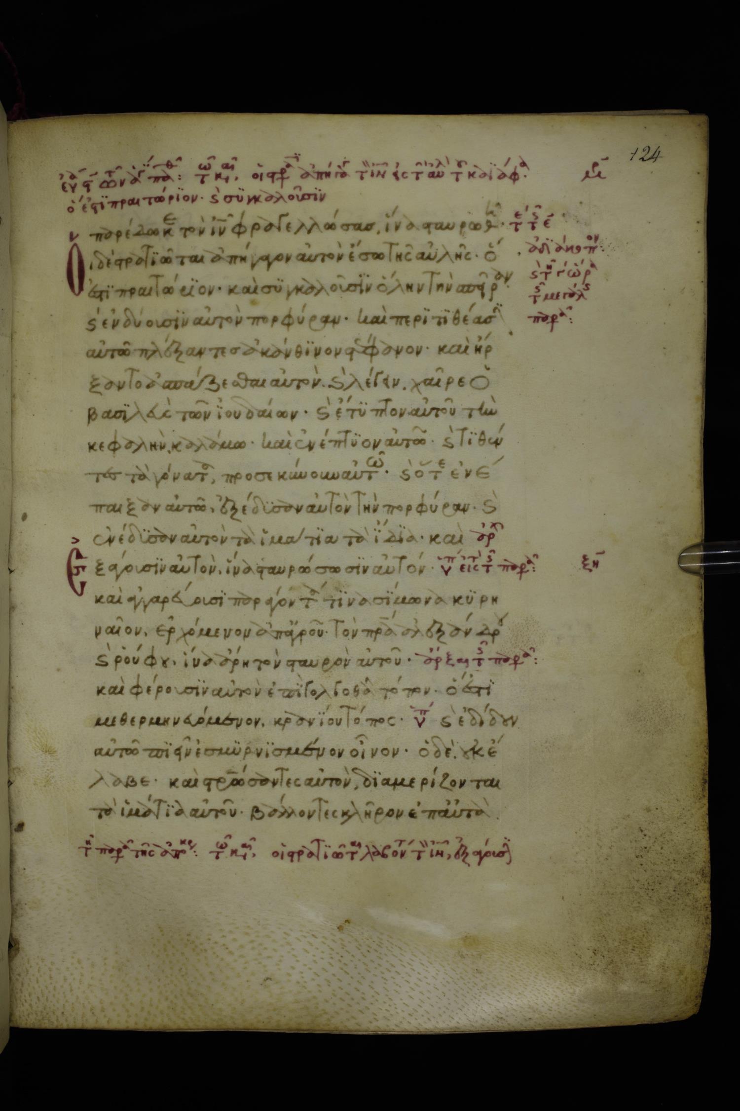Fourteenth century minuscule of the Gospels on parchment; 250 leaves, 1 column, 20-21 lines per column. Images were taken at the National Library of Greece in Athens.
