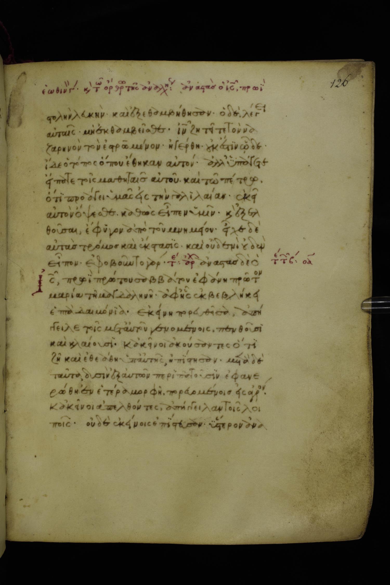 Fourteenth century minuscule of the Gospels on parchment; 250 leaves, 1 column, 20-21 lines per column. Images were taken at the National Library of Greece in Athens.