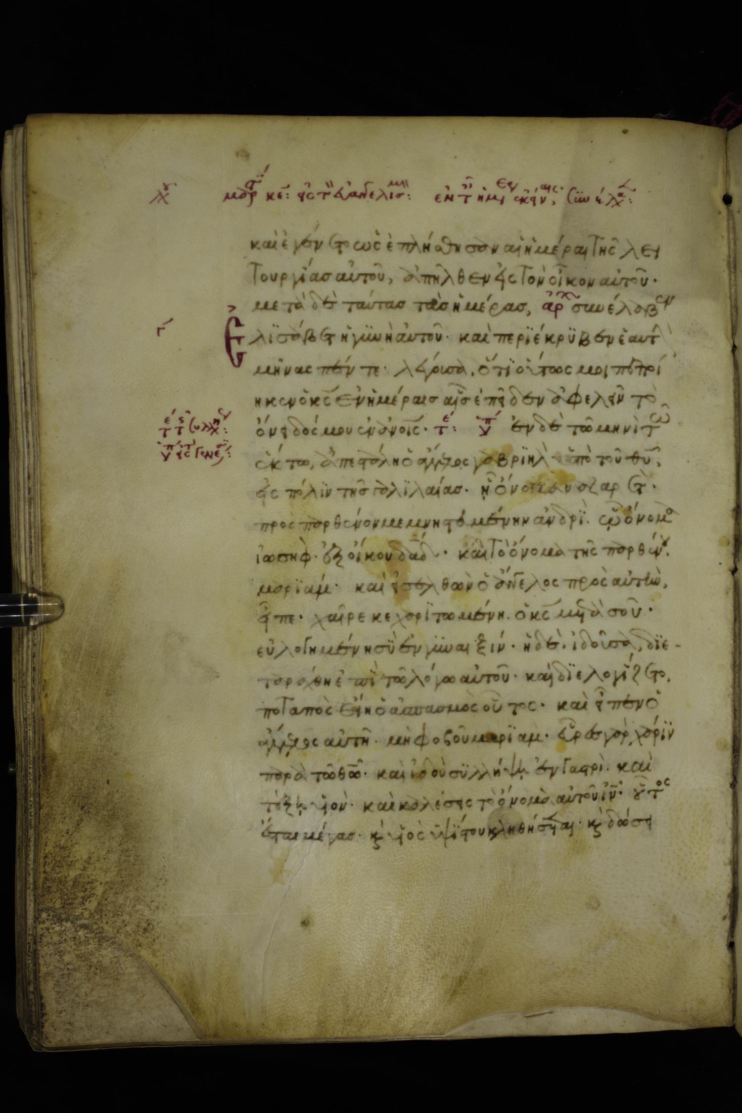 Fourteenth century minuscule of the Gospels on parchment; 250 leaves, 1 column, 20-21 lines per column. Images were taken at the National Library of Greece in Athens.