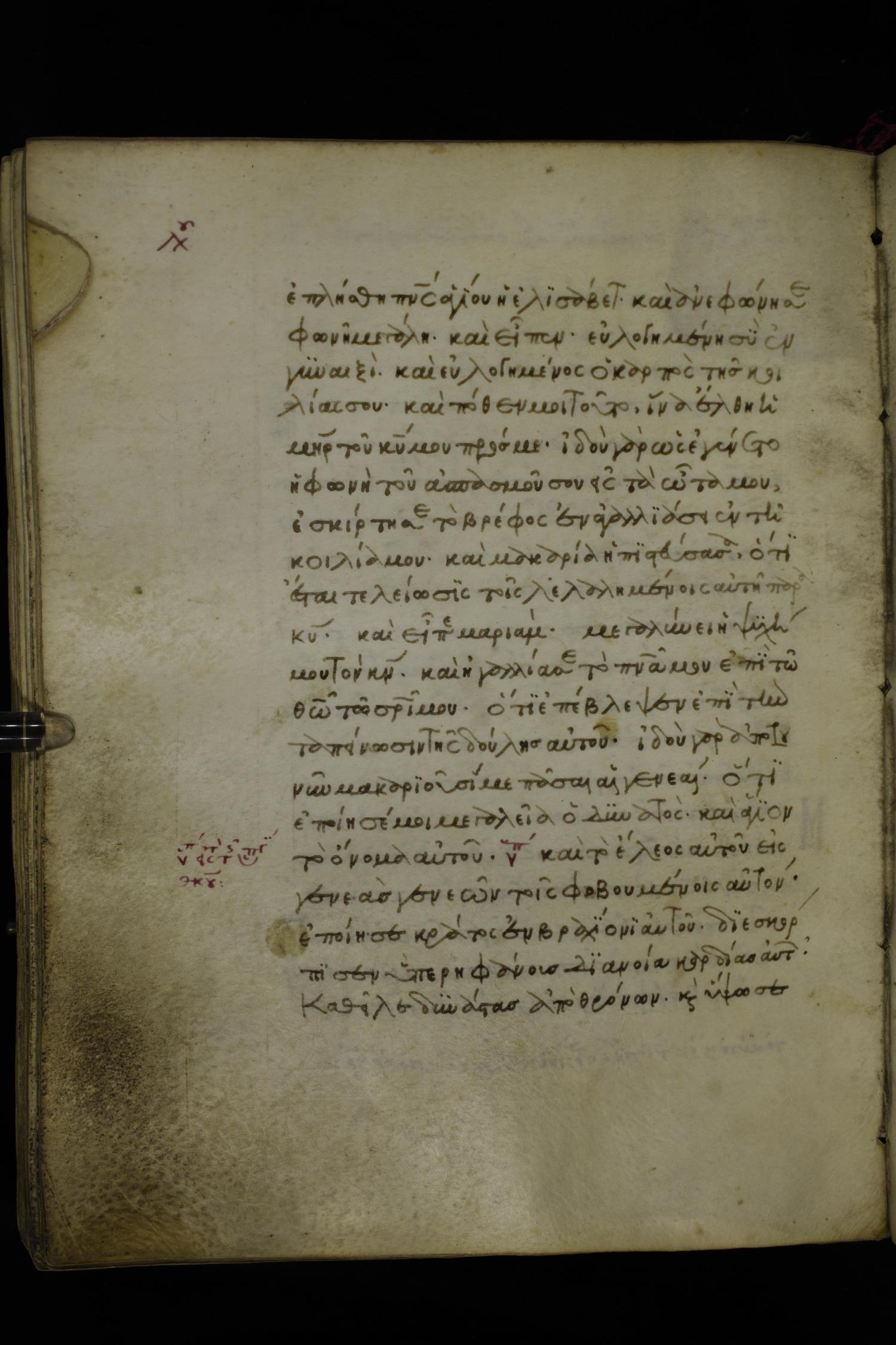 Fourteenth century minuscule of the Gospels on parchment; 250 leaves, 1 column, 20-21 lines per column. Images were taken at the National Library of Greece in Athens.