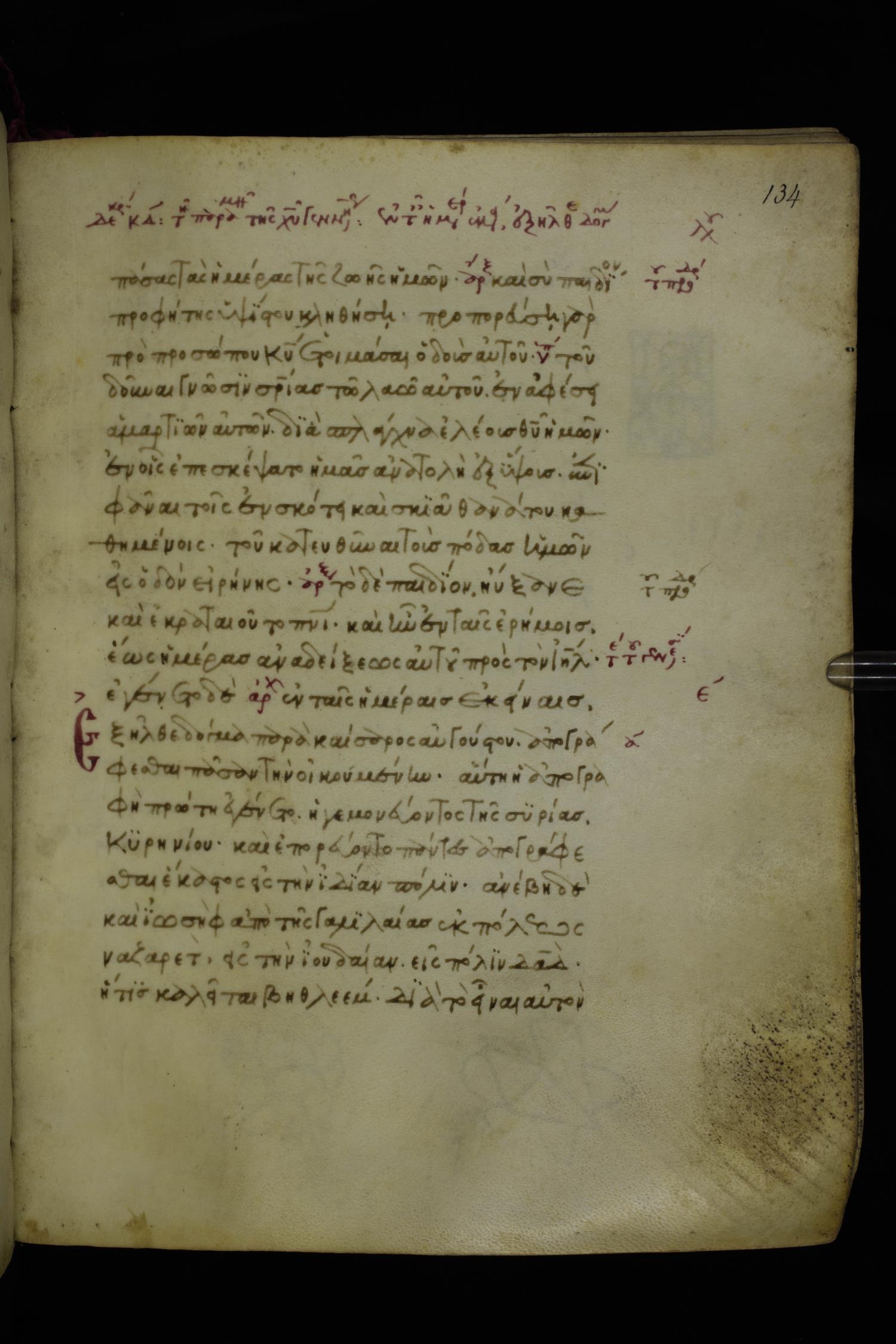 Fourteenth century minuscule of the Gospels on parchment; 250 leaves, 1 column, 20-21 lines per column. Images were taken at the National Library of Greece in Athens.