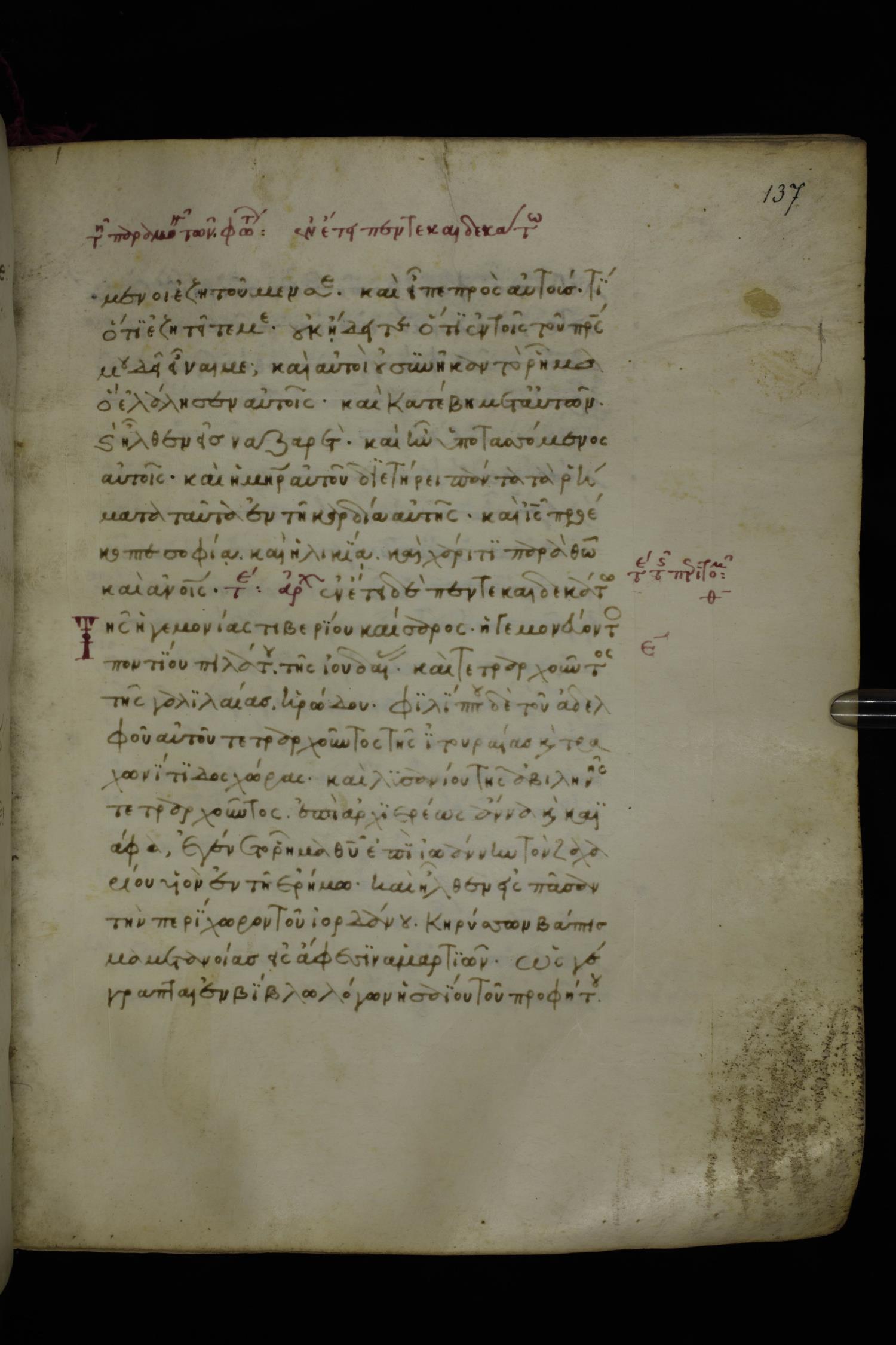 Fourteenth century minuscule of the Gospels on parchment; 250 leaves, 1 column, 20-21 lines per column. Images were taken at the National Library of Greece in Athens.
