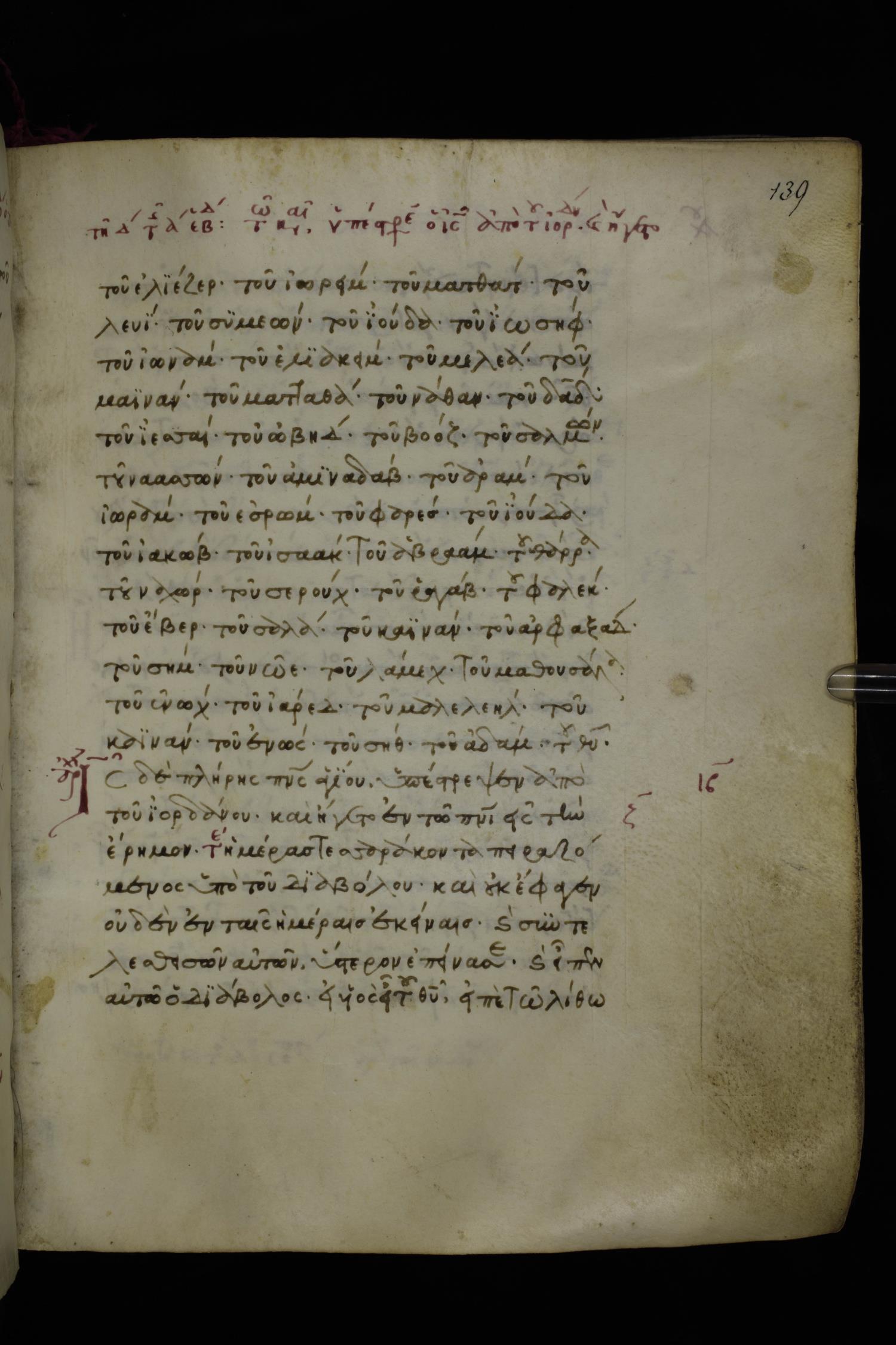 Fourteenth century minuscule of the Gospels on parchment; 250 leaves, 1 column, 20-21 lines per column. Images were taken at the National Library of Greece in Athens.