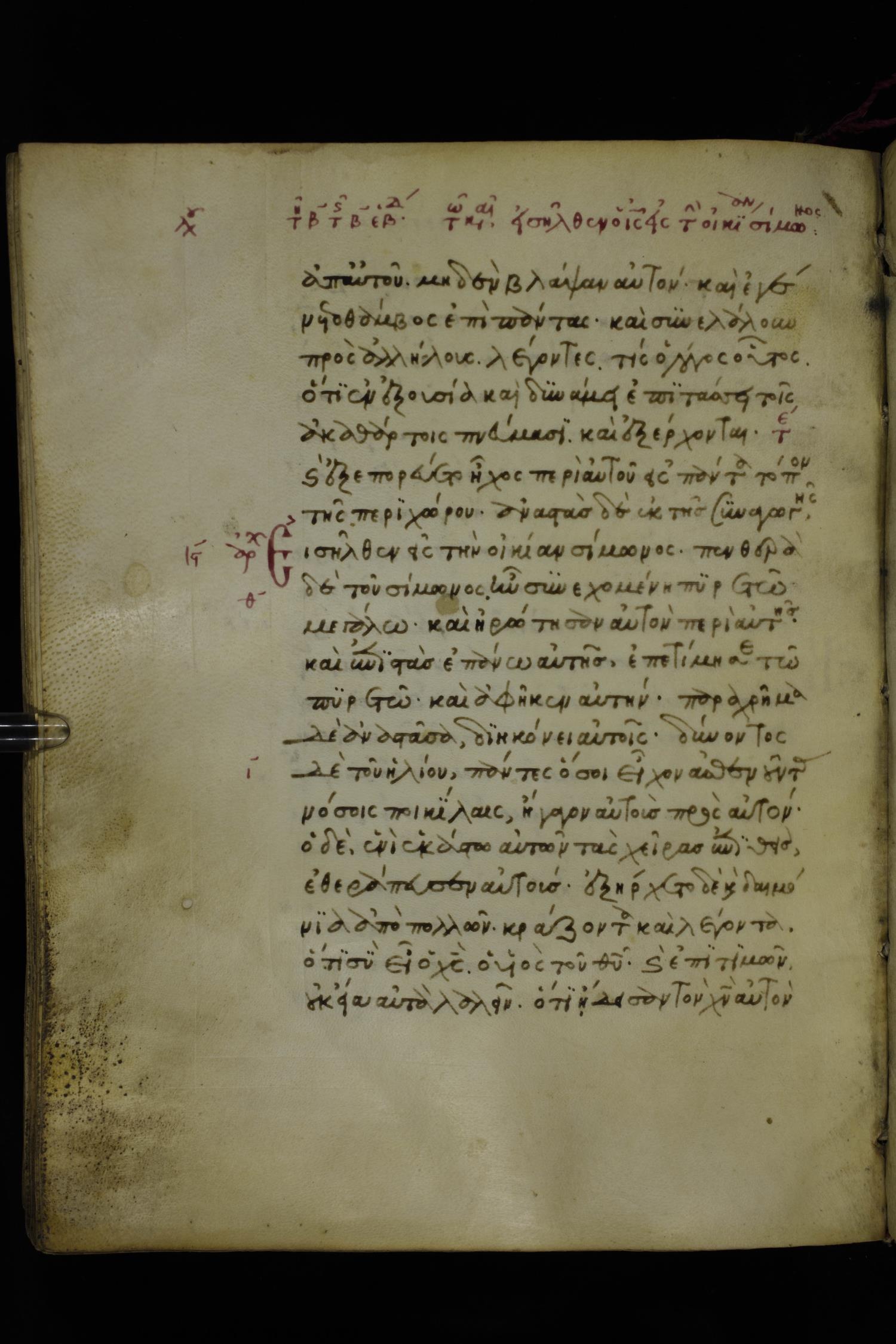 Fourteenth century minuscule of the Gospels on parchment; 250 leaves, 1 column, 20-21 lines per column. Images were taken at the National Library of Greece in Athens.