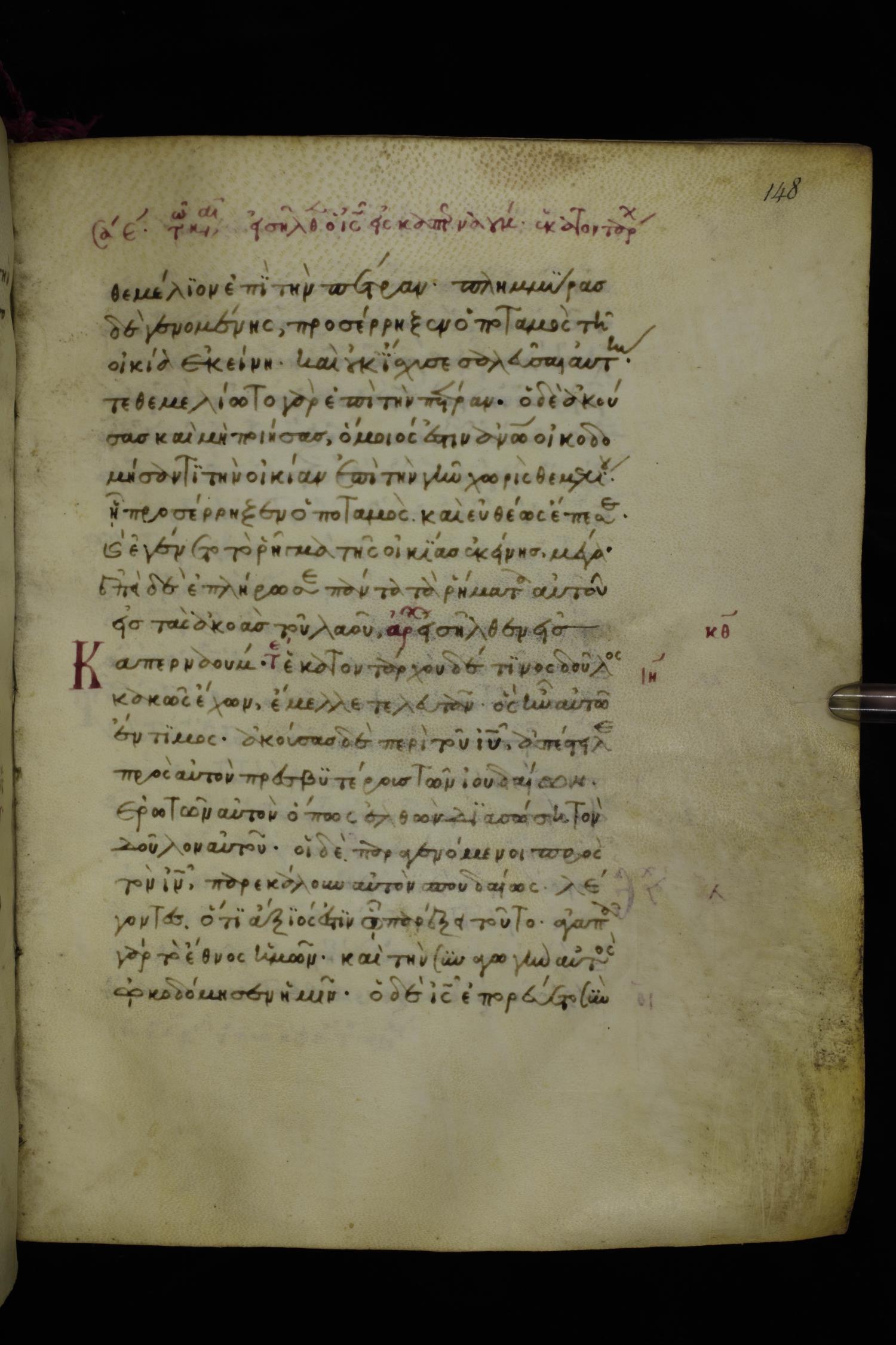 Fourteenth century minuscule of the Gospels on parchment; 250 leaves, 1 column, 20-21 lines per column. Images were taken at the National Library of Greece in Athens.
