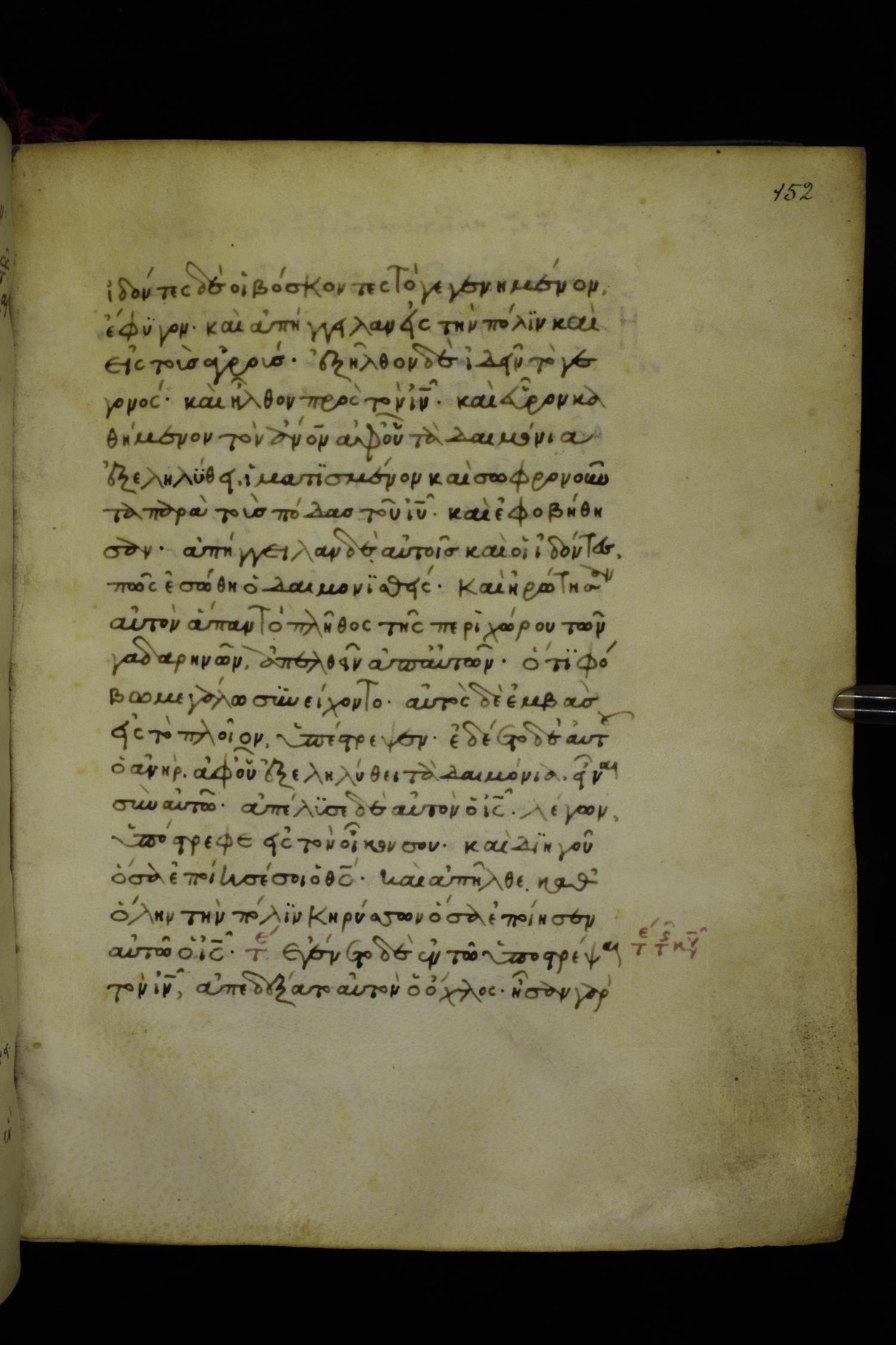 Fourteenth century minuscule of the Gospels on parchment; 250 leaves, 1 column, 20-21 lines per column. Images were taken at the National Library of Greece in Athens.